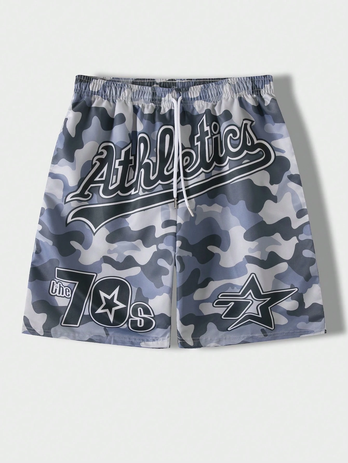 Prep Männer Shorts mit Tarnfarben & Buchstaben Grafik, Tunnelzug,