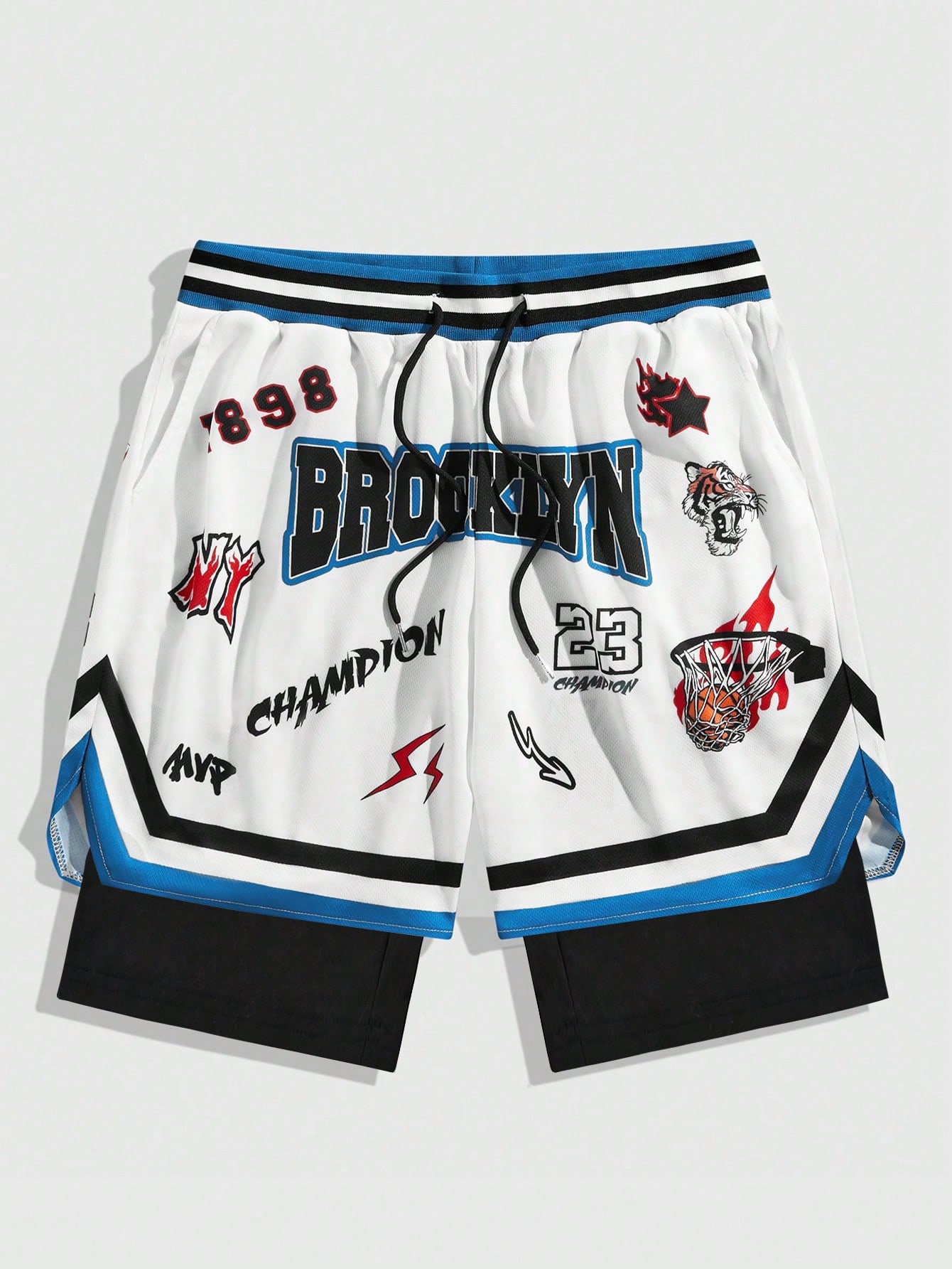 Prep Herren einfarbige Basketball-Shorts mit Patchwork-Vorderseite und Schnürung, Taschen, 2-in-1-Design