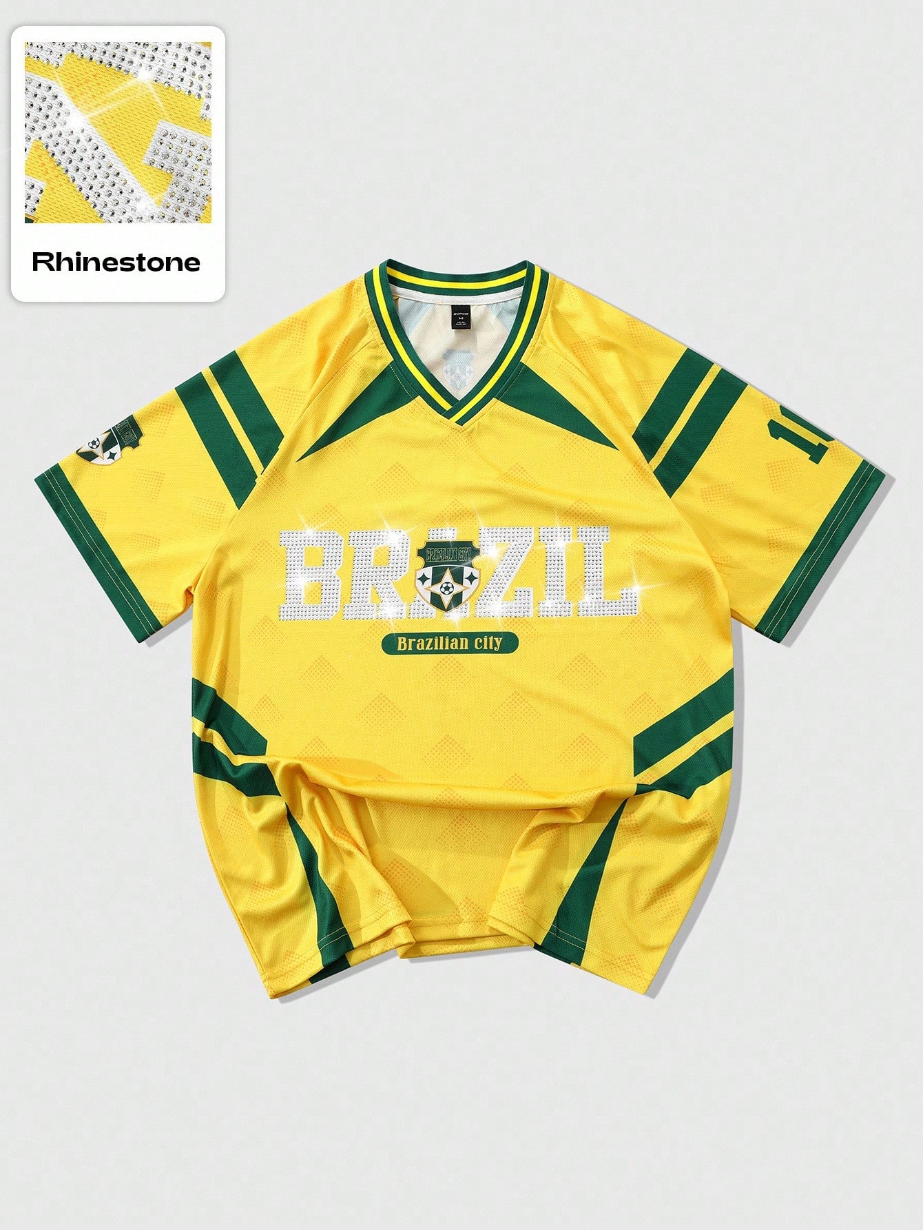 Prep Herren T-Shirt Set, Brasilien Fußball Sport T-Shirt mit "BRAZIL" Englisch Abzeichen Grafik Muster, Fußball Streetwear Kurzarm