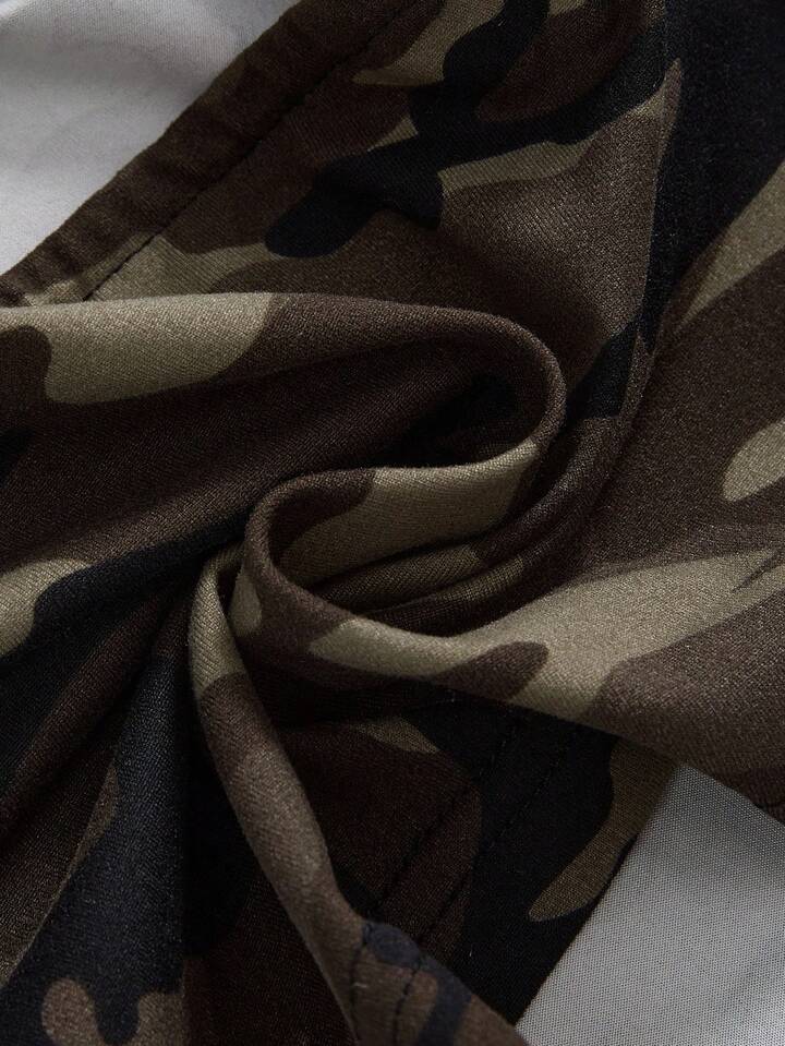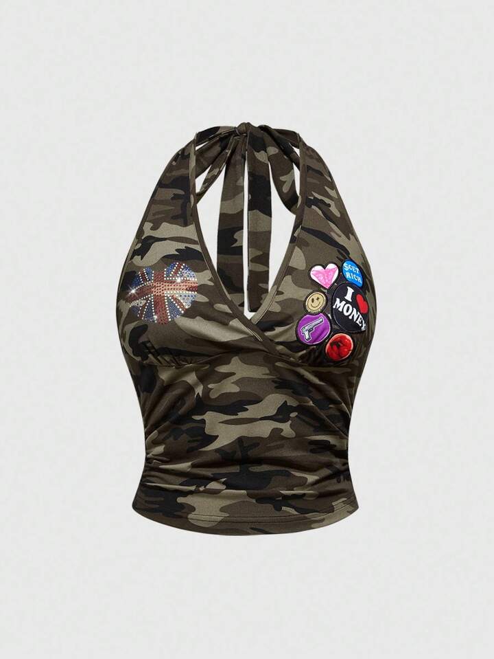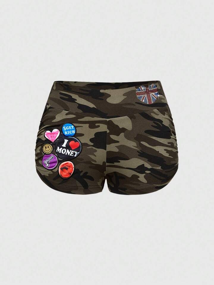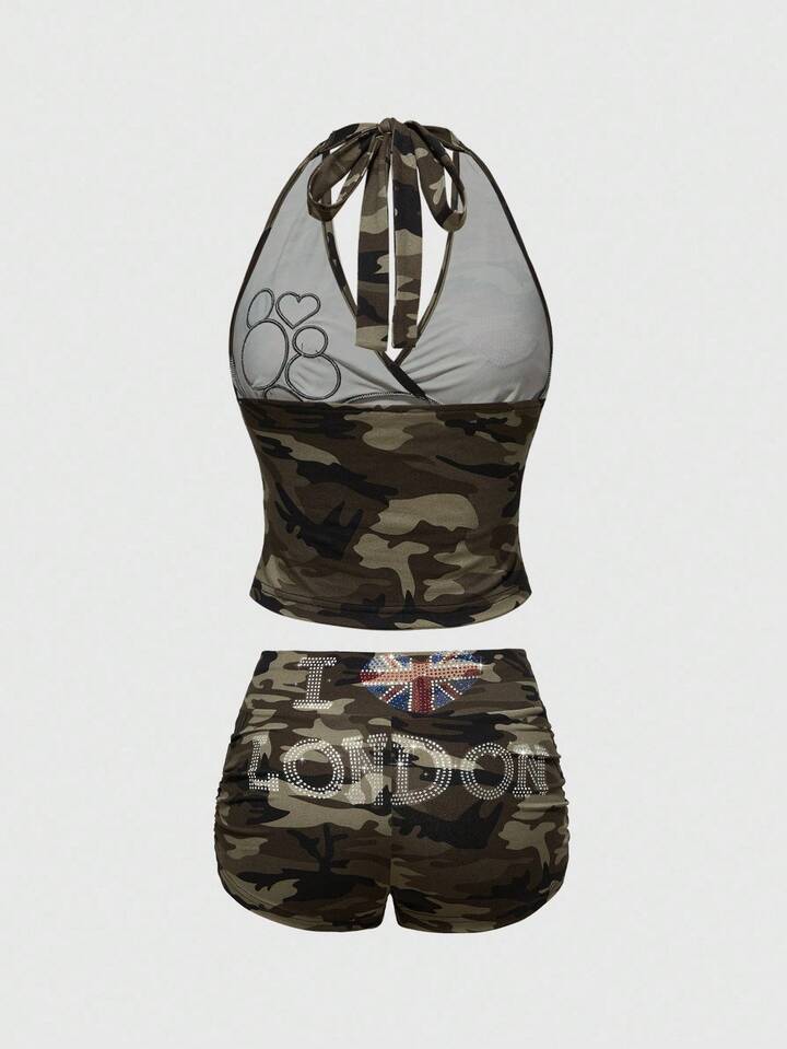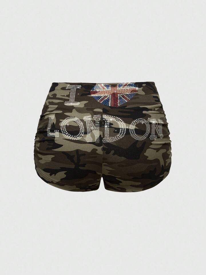 ROMWE Avant 2 Stücke Damen Crop Top mit Strass-Verzierung im Millennium Retro Camouflage-Muster, englischer Flaggen-Patch & kurze Hose mit niedriger Taille Set