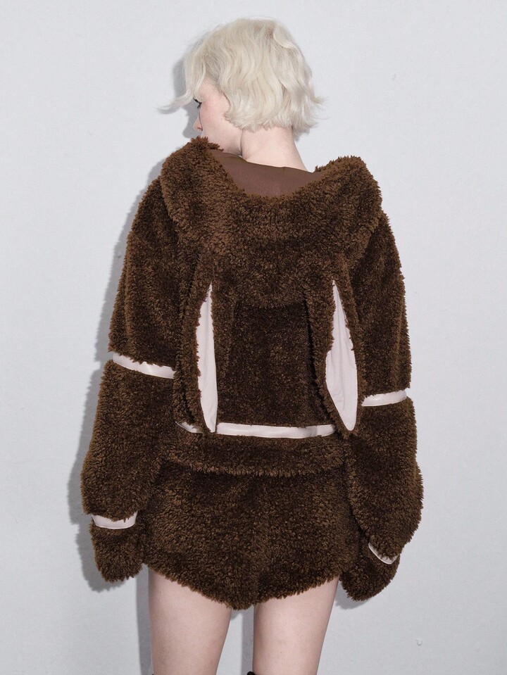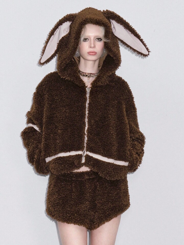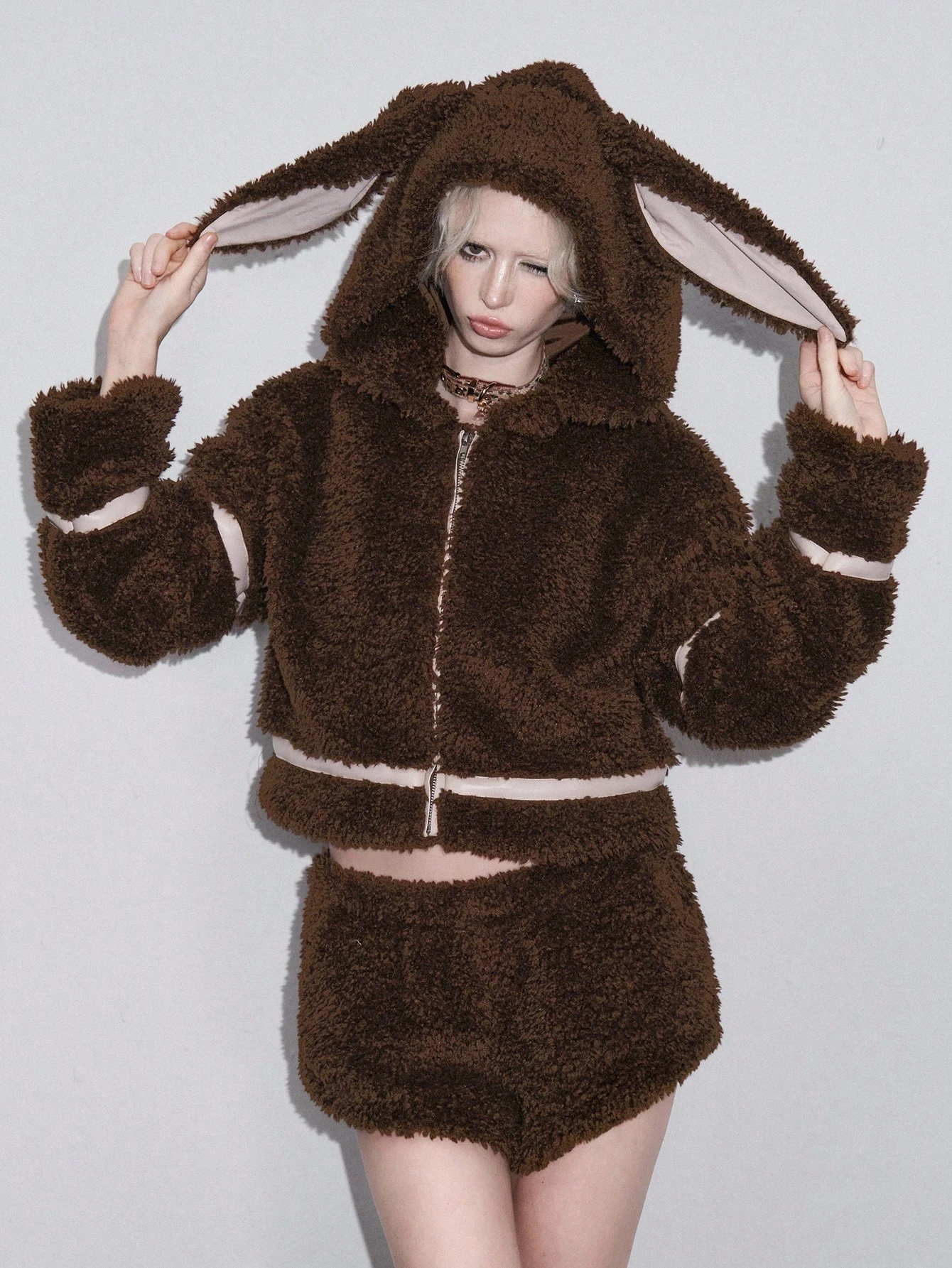 ROMWE Avant 2 Stücke Y2K Baddie Kawaii Hasen Ohr Lässige Warme Flauschige Jacke und Shorts Set