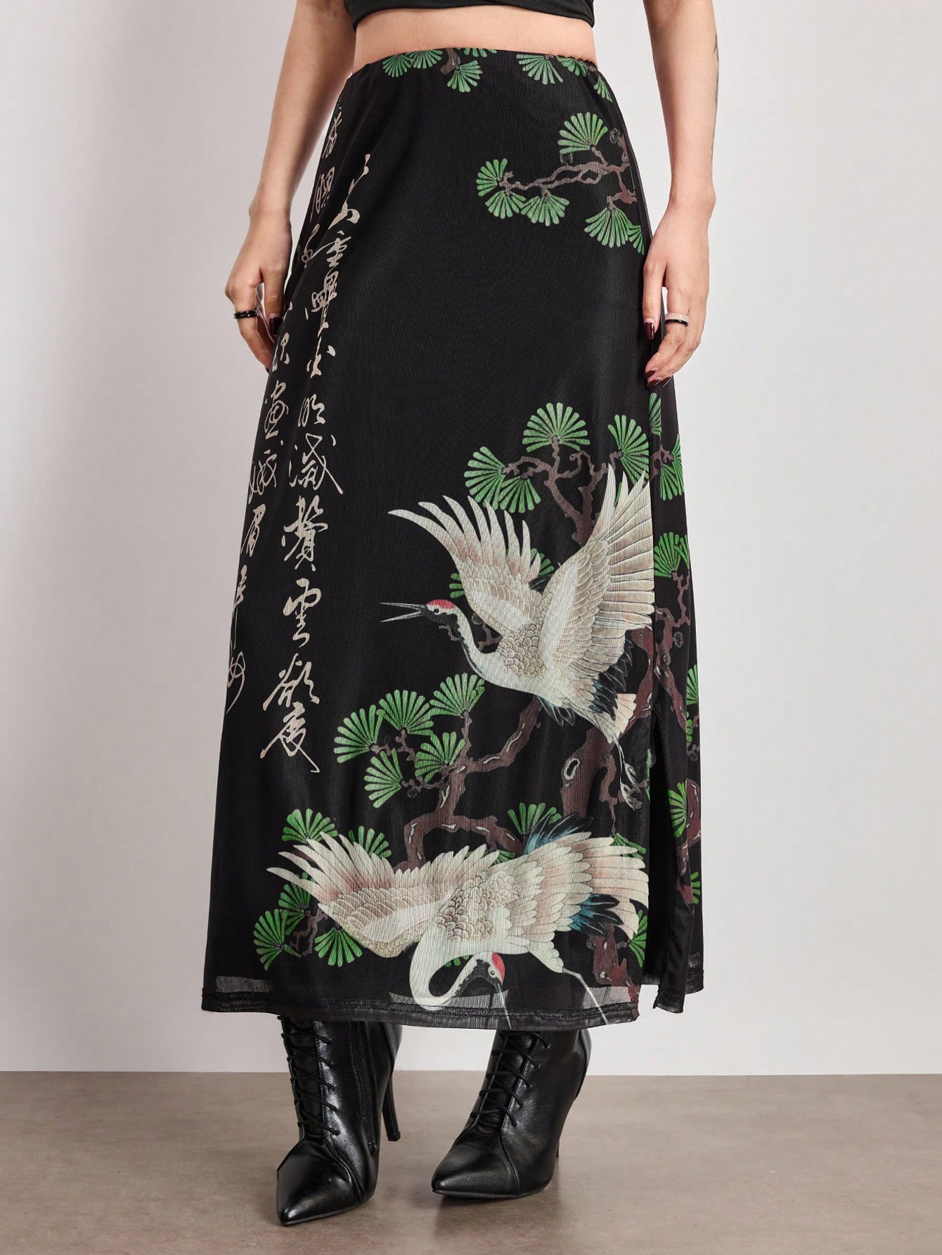 ROMWE Avant Chinesischer Stil Kranich & Kalligraphie Kiefer Muster Schlitzrock für Frauen