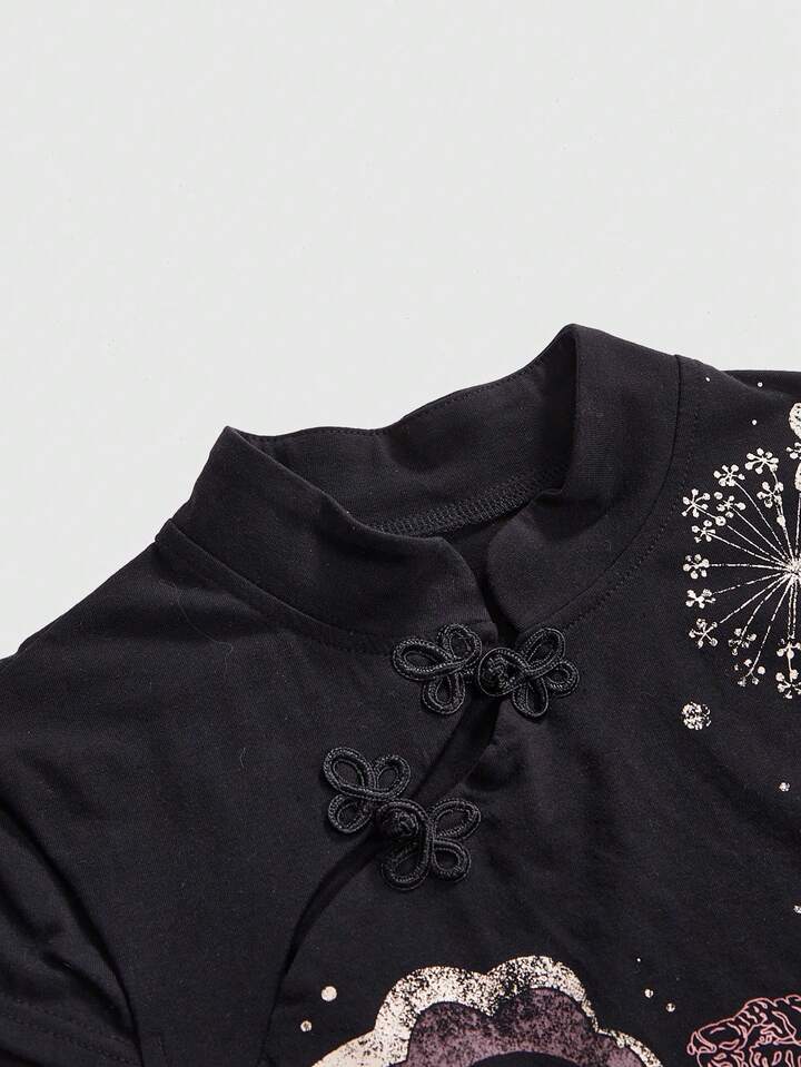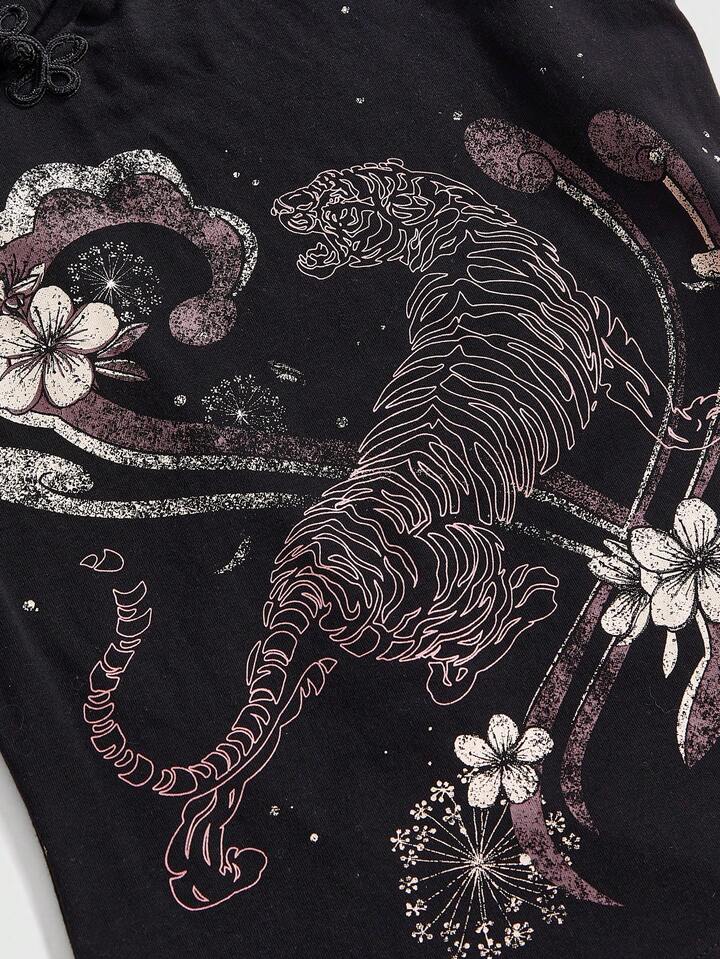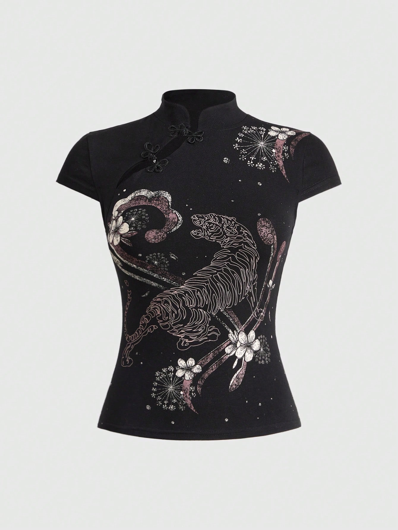 ROMWE Avant Markanter chinesischer Stil Mandarin Kragen Chinesisch Tiger Muster Slim Fit Damen Top
