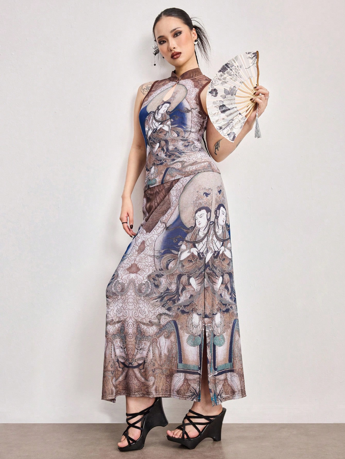 ROMWE Avant Elegantes 2-teiliges Set: Chinesischer Stil Buddha Gemälde Muster Mandarin Kragen ärmelloses Top und Rock