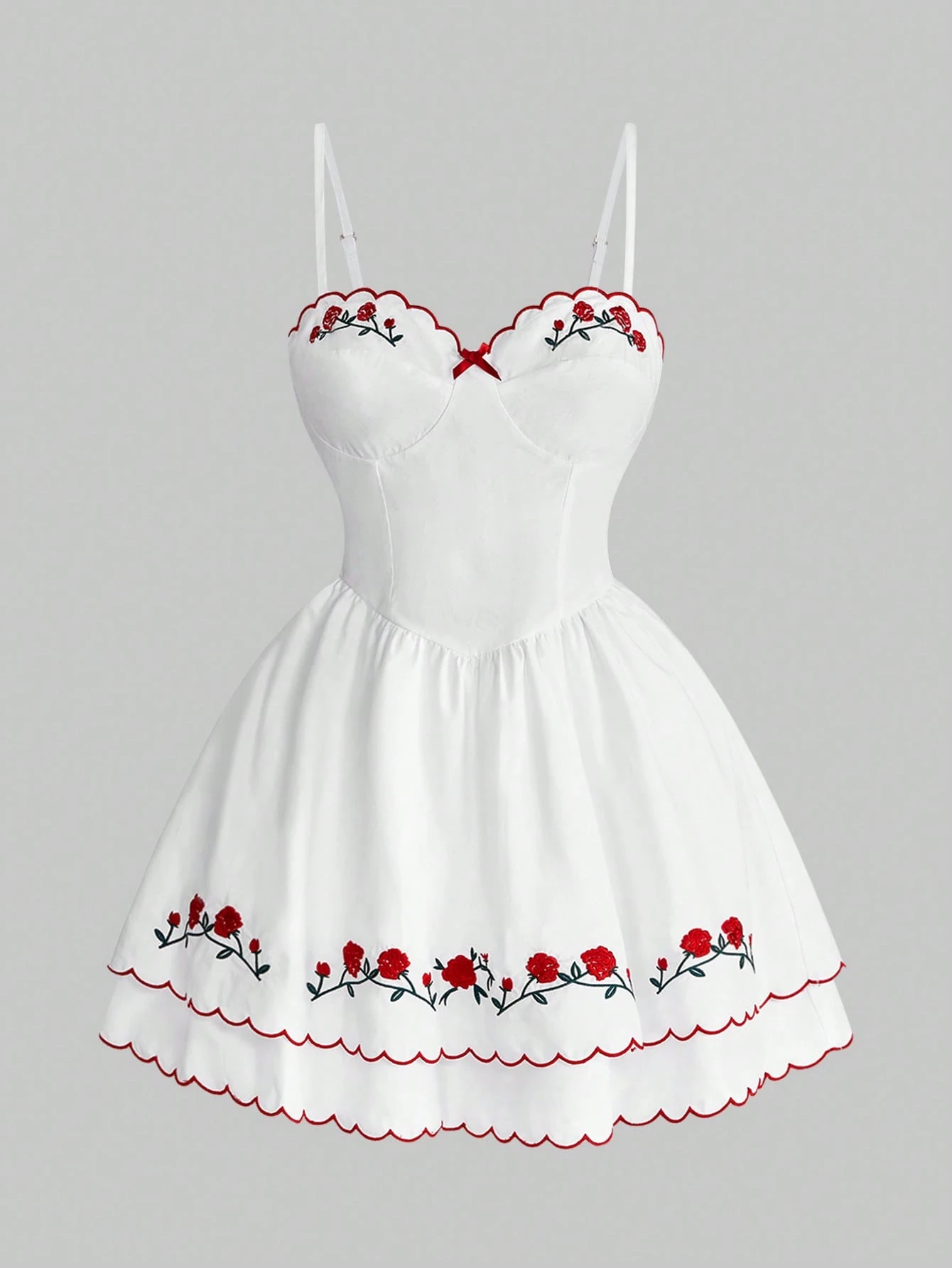 ROMWE Avant Französischer Urlaubsstil Rosen-Stickerei süßes Mini-Kleid für Frauen