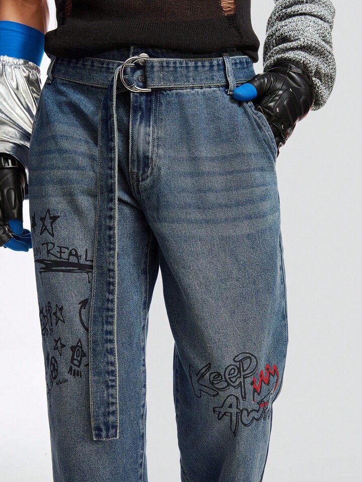 ROMWE Avant Männer Jeans mit geradem Beinschnitt, Buchstabe & Cartoon Grafik,