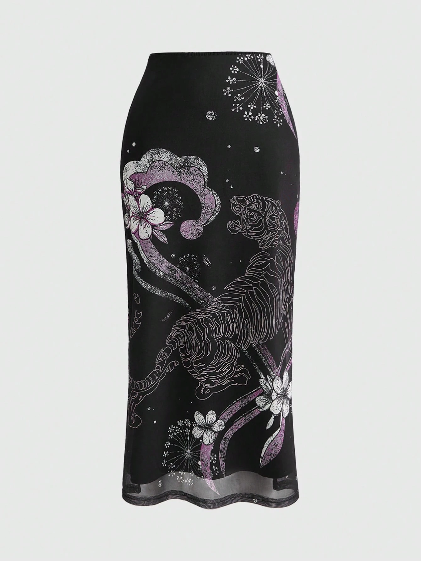 ROMWE Avant Neuer chinesischer Stil Retro Tiger Muster & Blumenmuster Mesh Meerjungfrau Saum Bleistiftrock