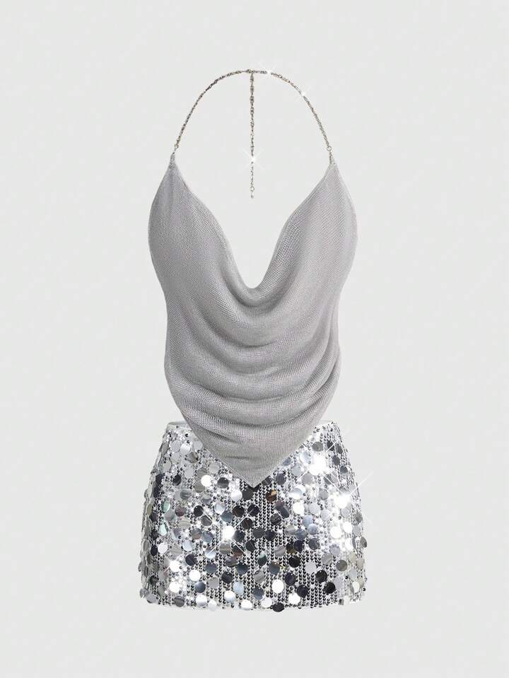 ROMWE Avant Neujahrs-Party Metall-Drapierte Weste & Ultratief Taillierter Mini Bodycon Rock 2-teiliges Set für Frauen