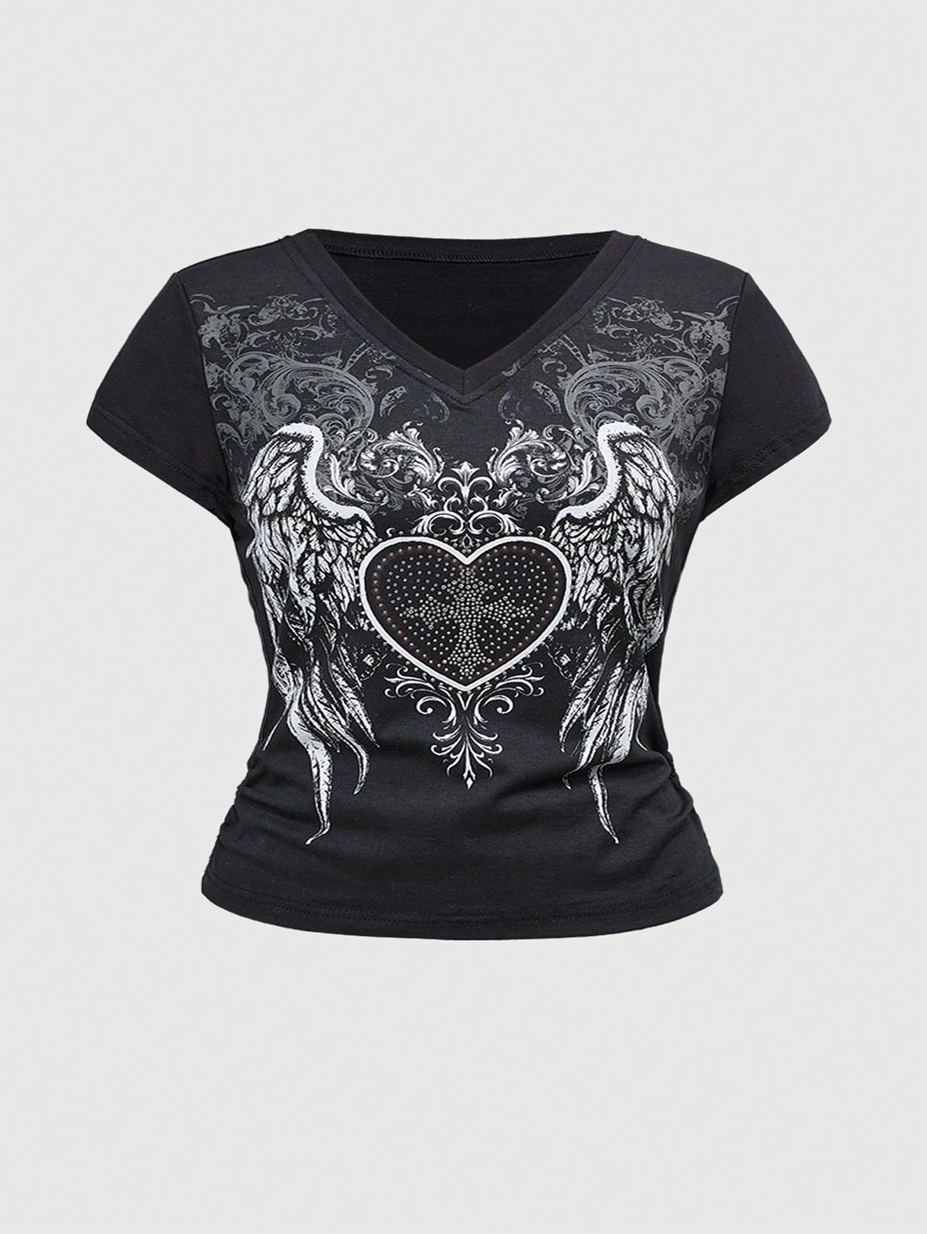 ROMWE Avant Große Größen T-Shirt mit Flügel- und Herzstrasssteinverzierung, V-Ausschnitt, Kurzarm