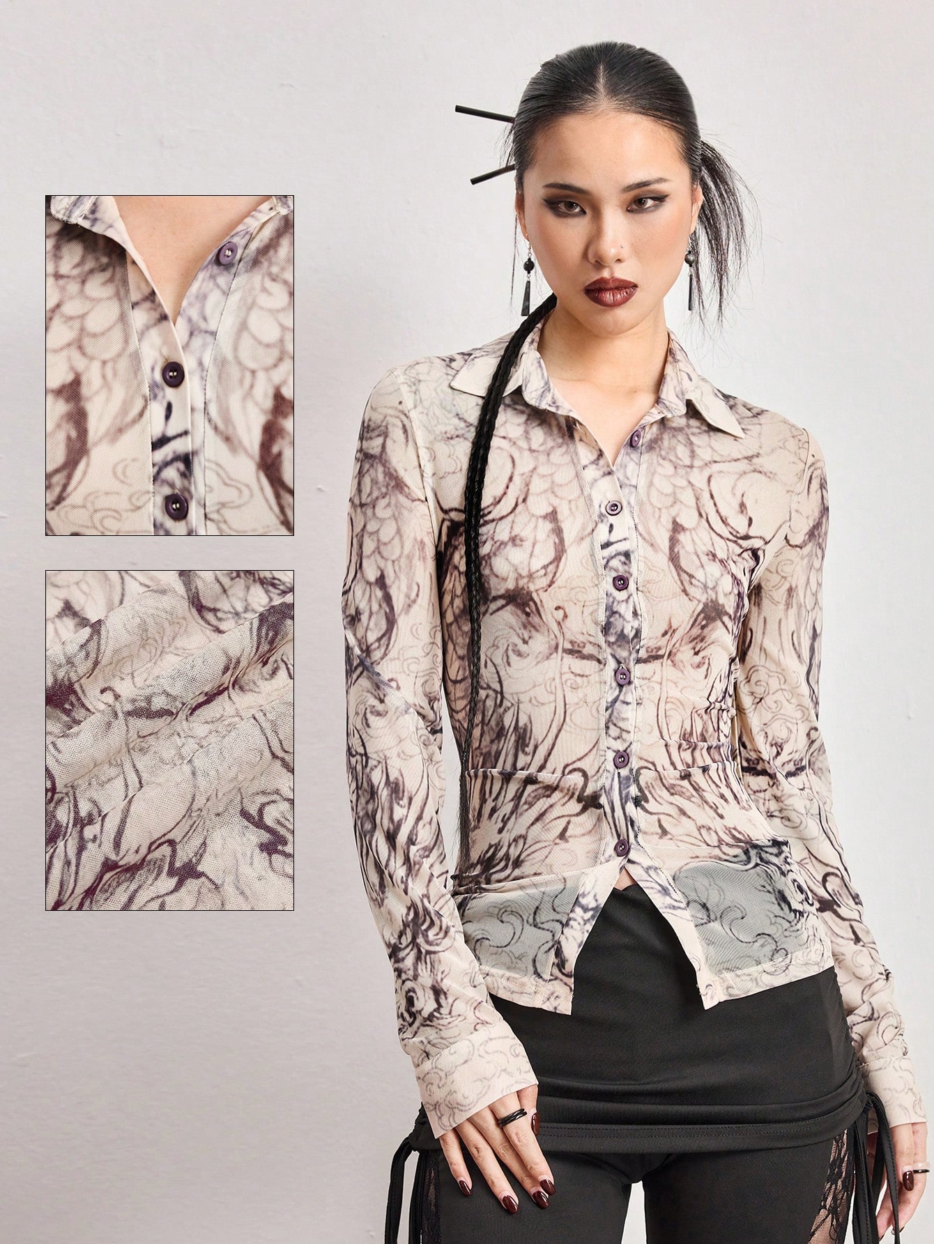 ROMWE Avant Vintage Drachen Muster Mesh Tattoo Bodycon Mesh Shirt