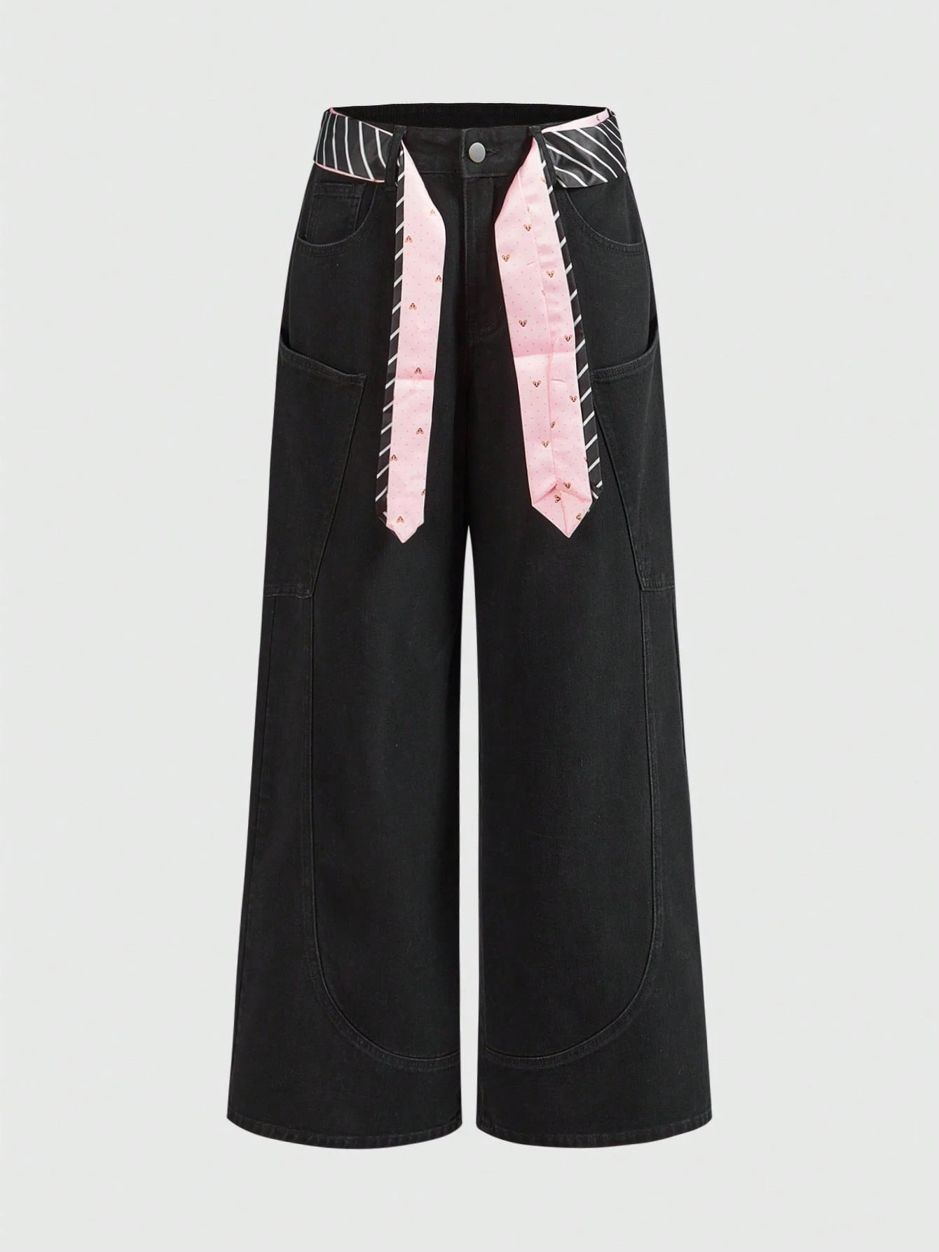 ROMWE Avant Unisex Jeans mit tiefer Taille, dekonstriertem Design, weiten Taschen, schwarzer gerader Passform und weiter Silhouette