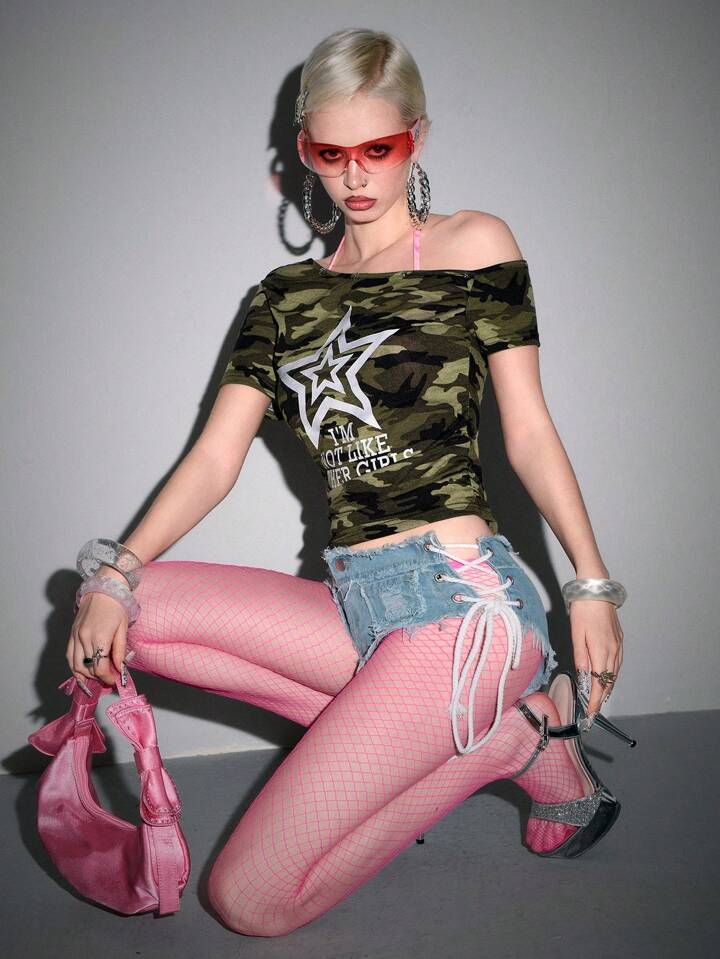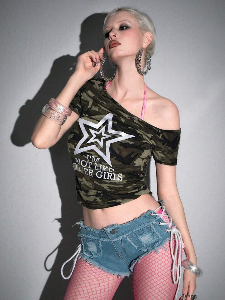 ROMWE Avant Damen asymmetrischer Ausschnitt Kurzarm Tarnung Stern Muster T-Shirt