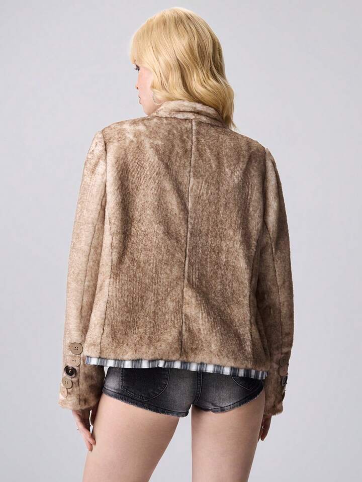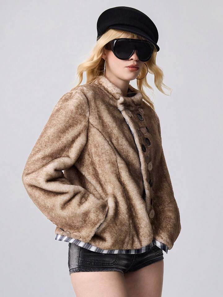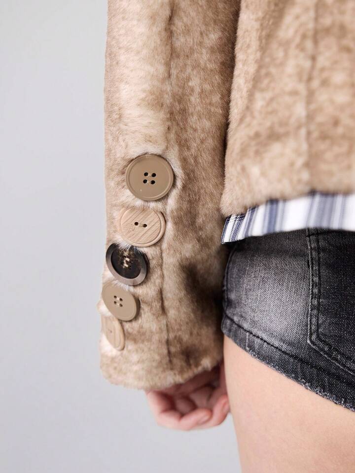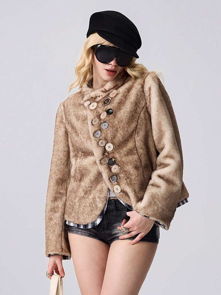 ROMWE Avant Damen asymmetrische Knopfdesign Langarm lose Kunstpelz Jacke, Winter