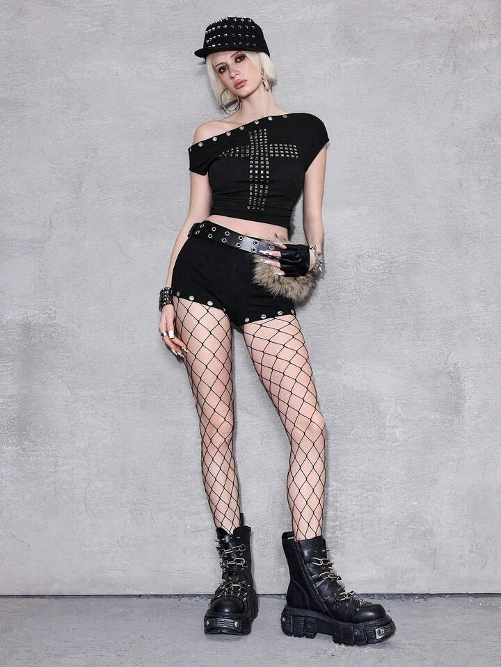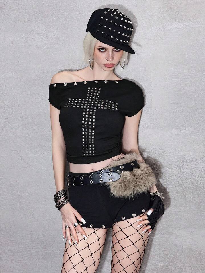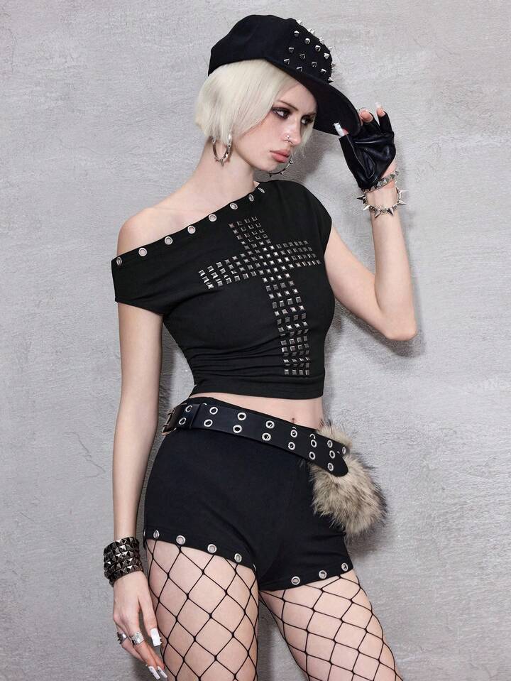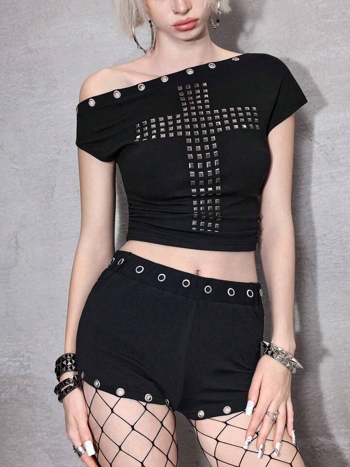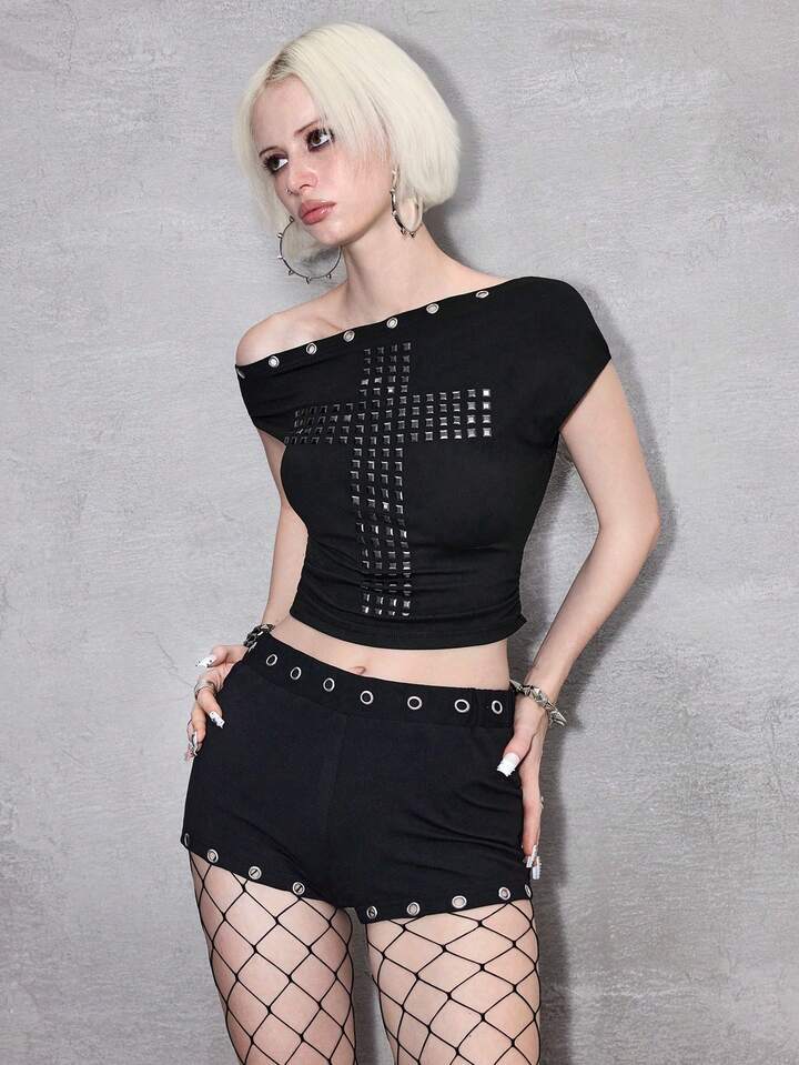 ROMWE Avant Damen Mode Set aus asymmetrischem Kragen Crop Top mit Kreuz-Strass und Shorts, 2 Stücke