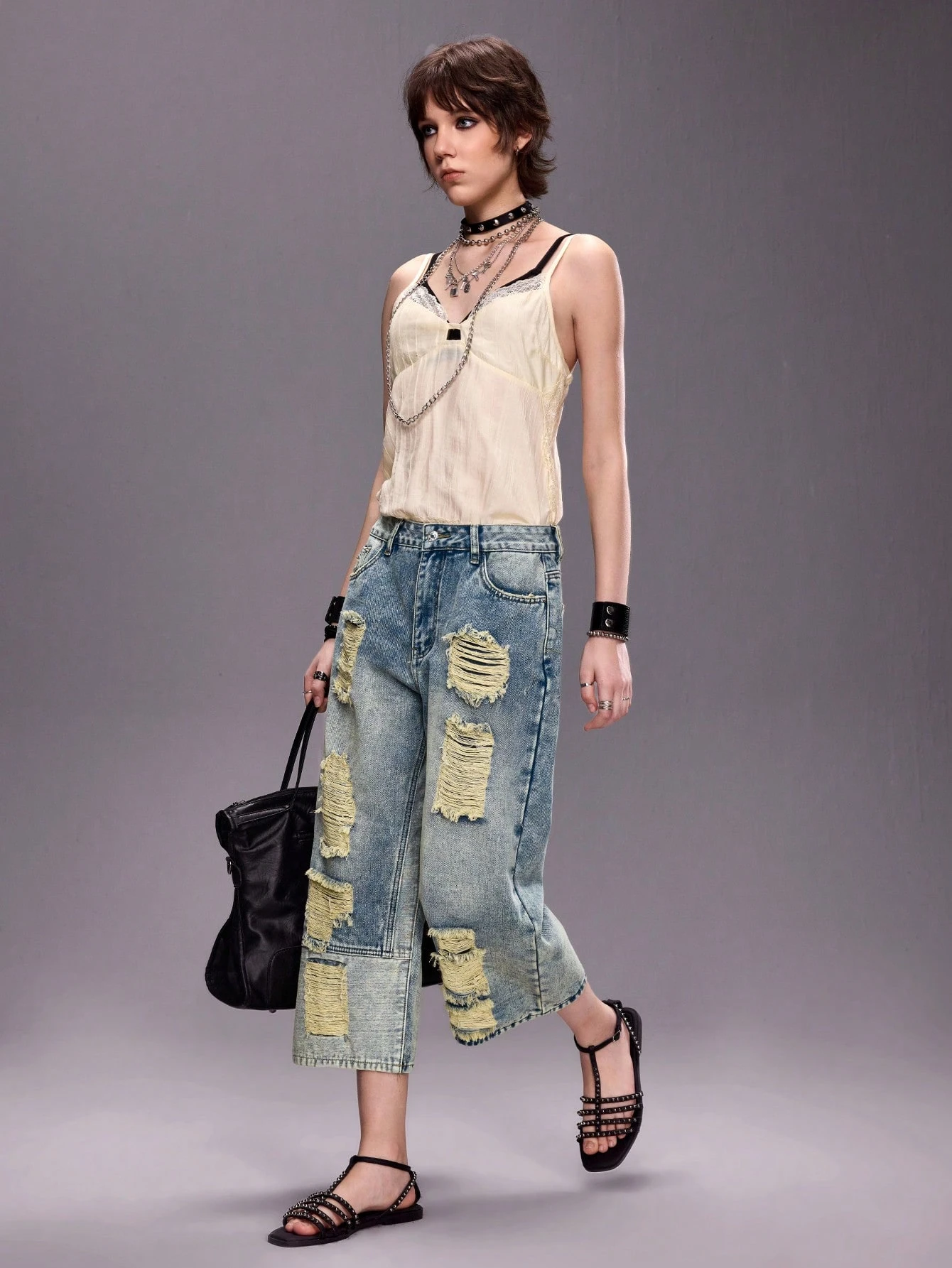ROMWE Avant Damen figurbetonte Jeans mit Patchwork-Optik und Destroyed-Effekt in 7/8 Länge