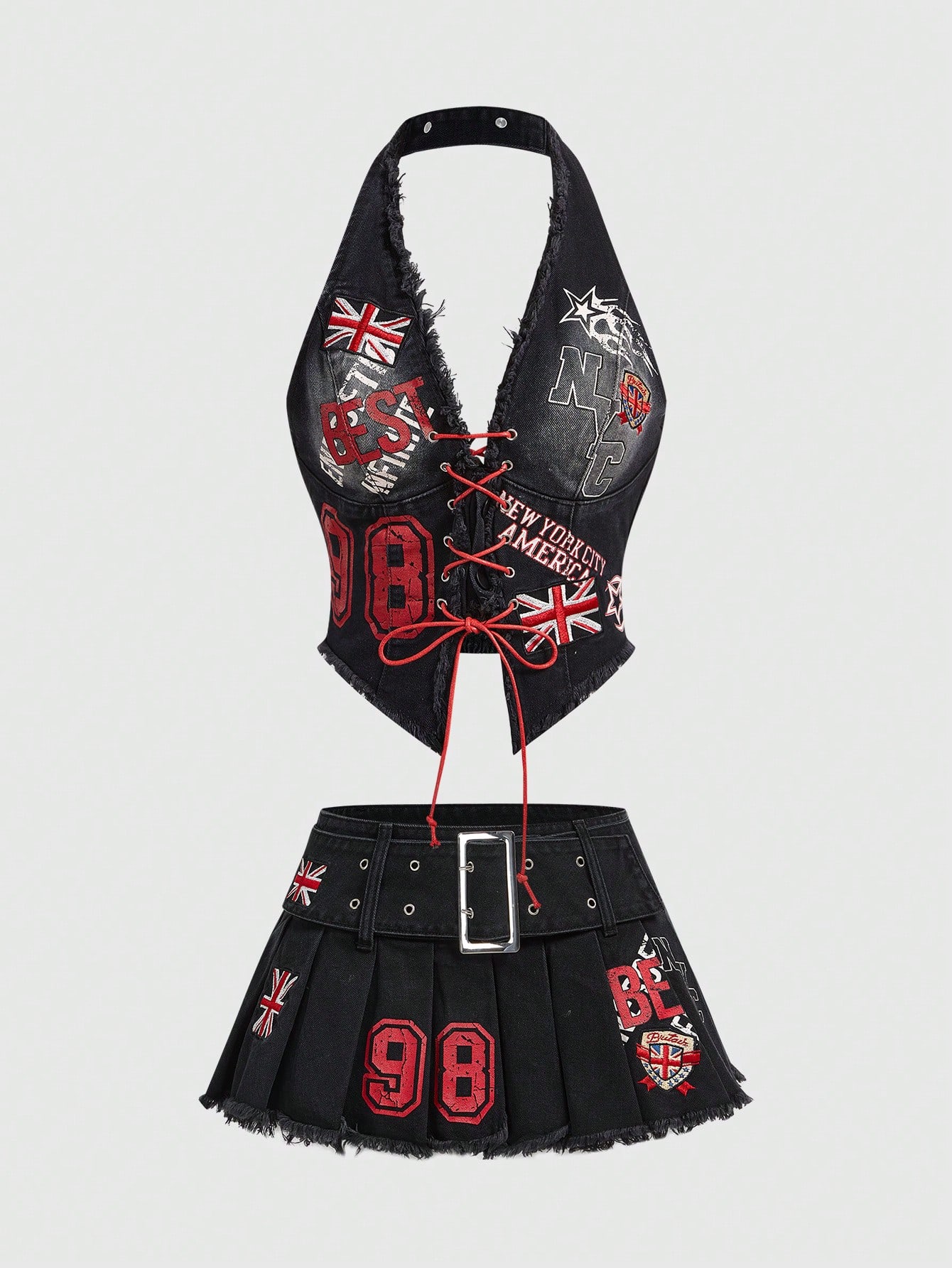 ROMWE Avant Damen Denim Top mit Trägerhalsausschnitt und figurbetonter Passform, kombiniert mit Denim Rock mit tiefer Taille und Falten, 2-teiliges Denim-Outfit