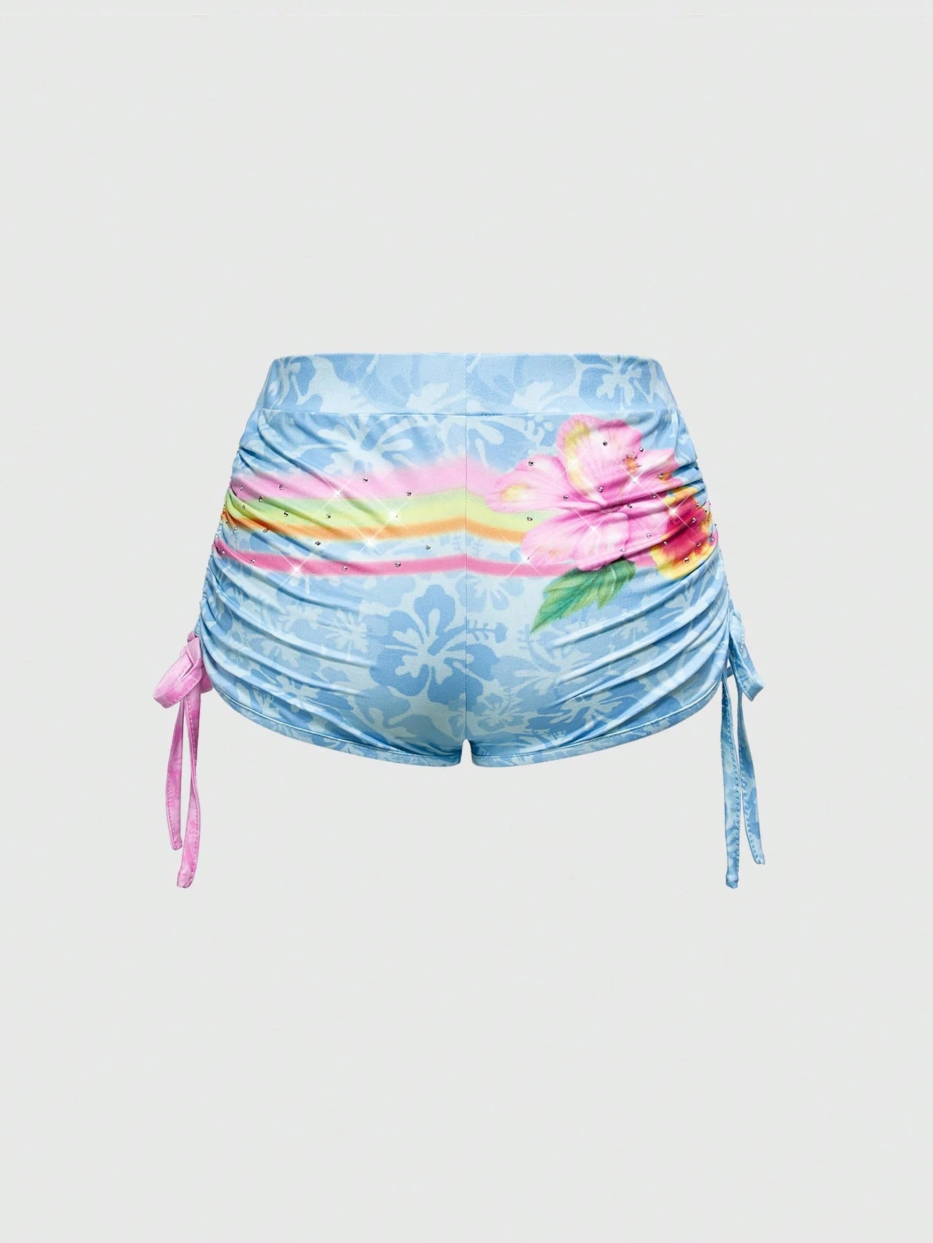 ROMWE Avant Damen Retro Sexy Urlaubs Kokos Mädchen Strass Kontrastfarbe Schnürung Super Tiefer Taille Mini Shorts