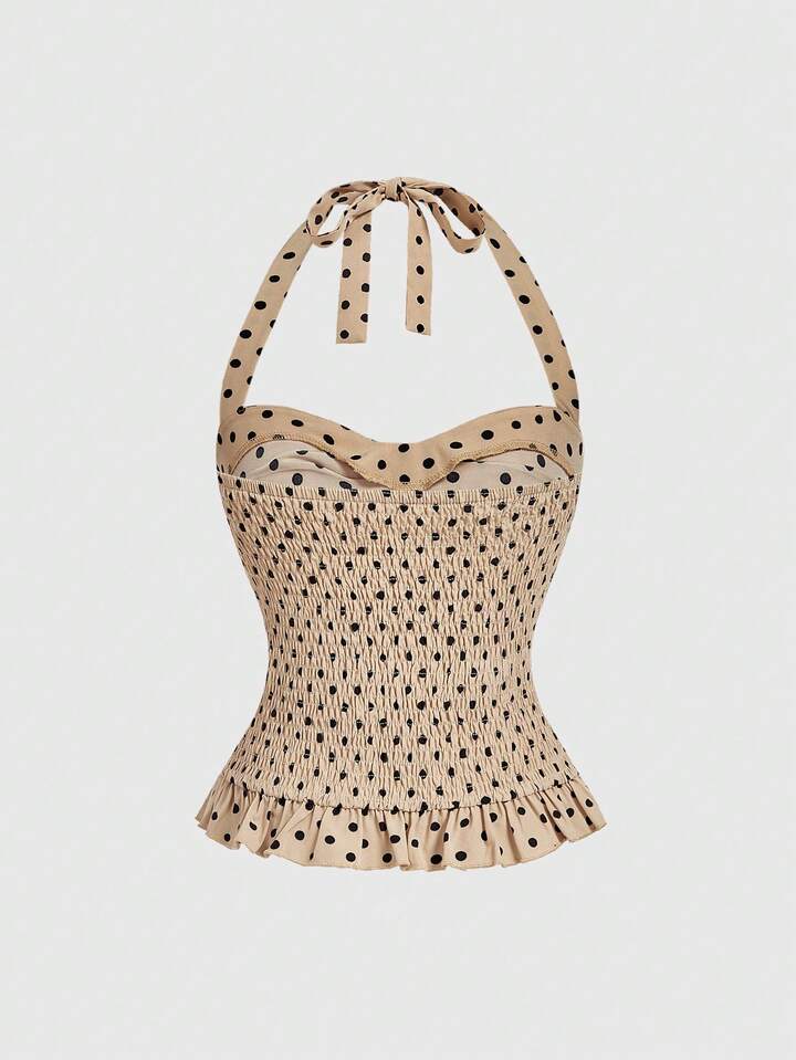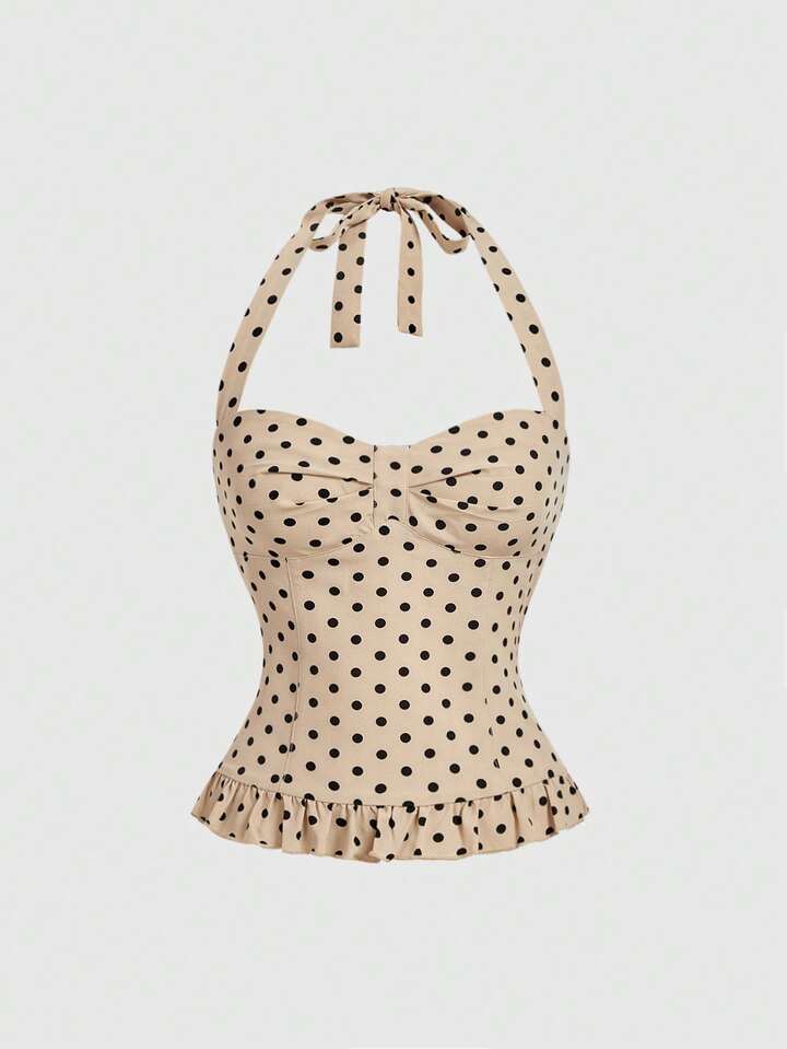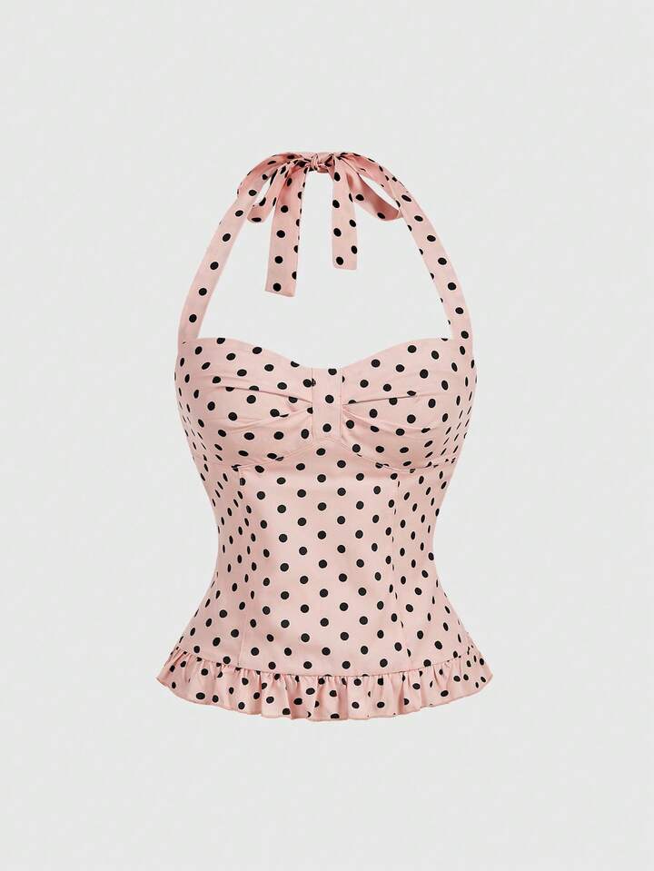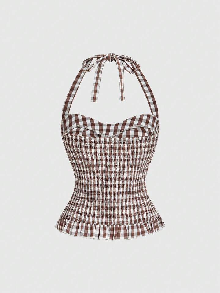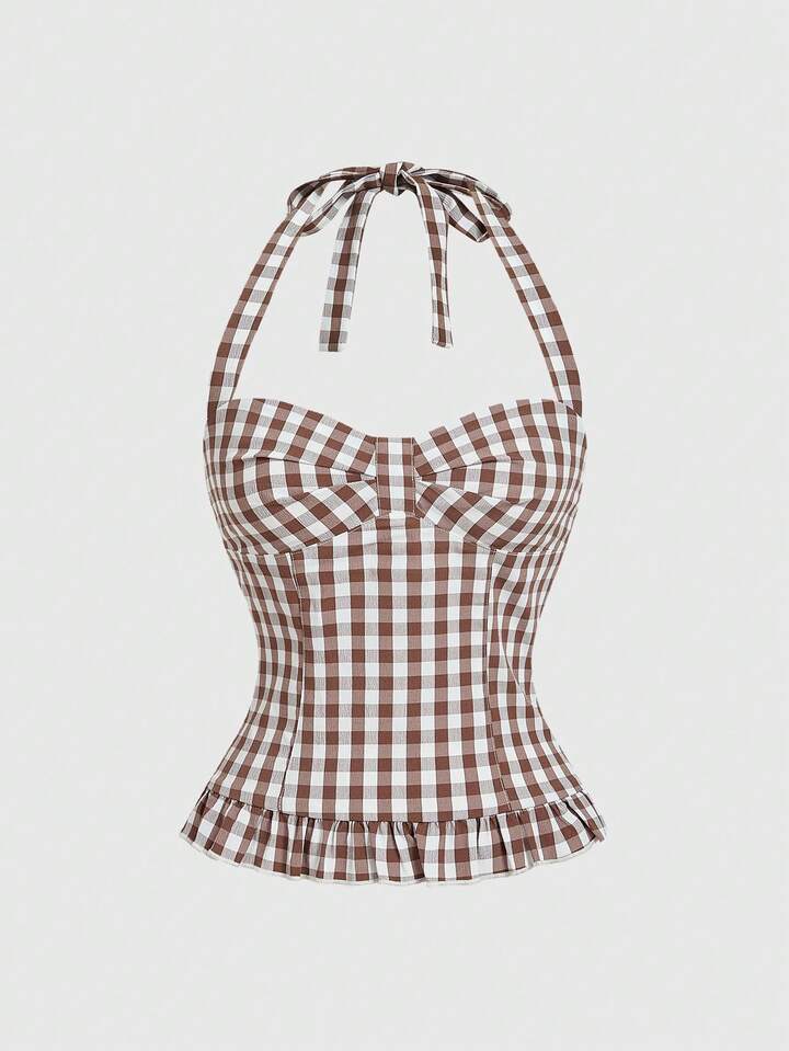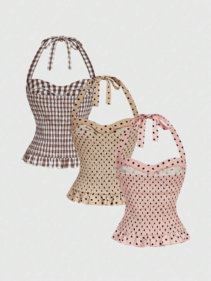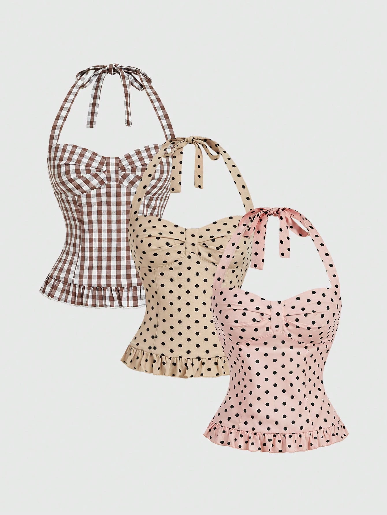ROMWE Avant Damen romantischer Urlaubsstil Polka Dot & Karomuster rückenfrei Trägertop Set