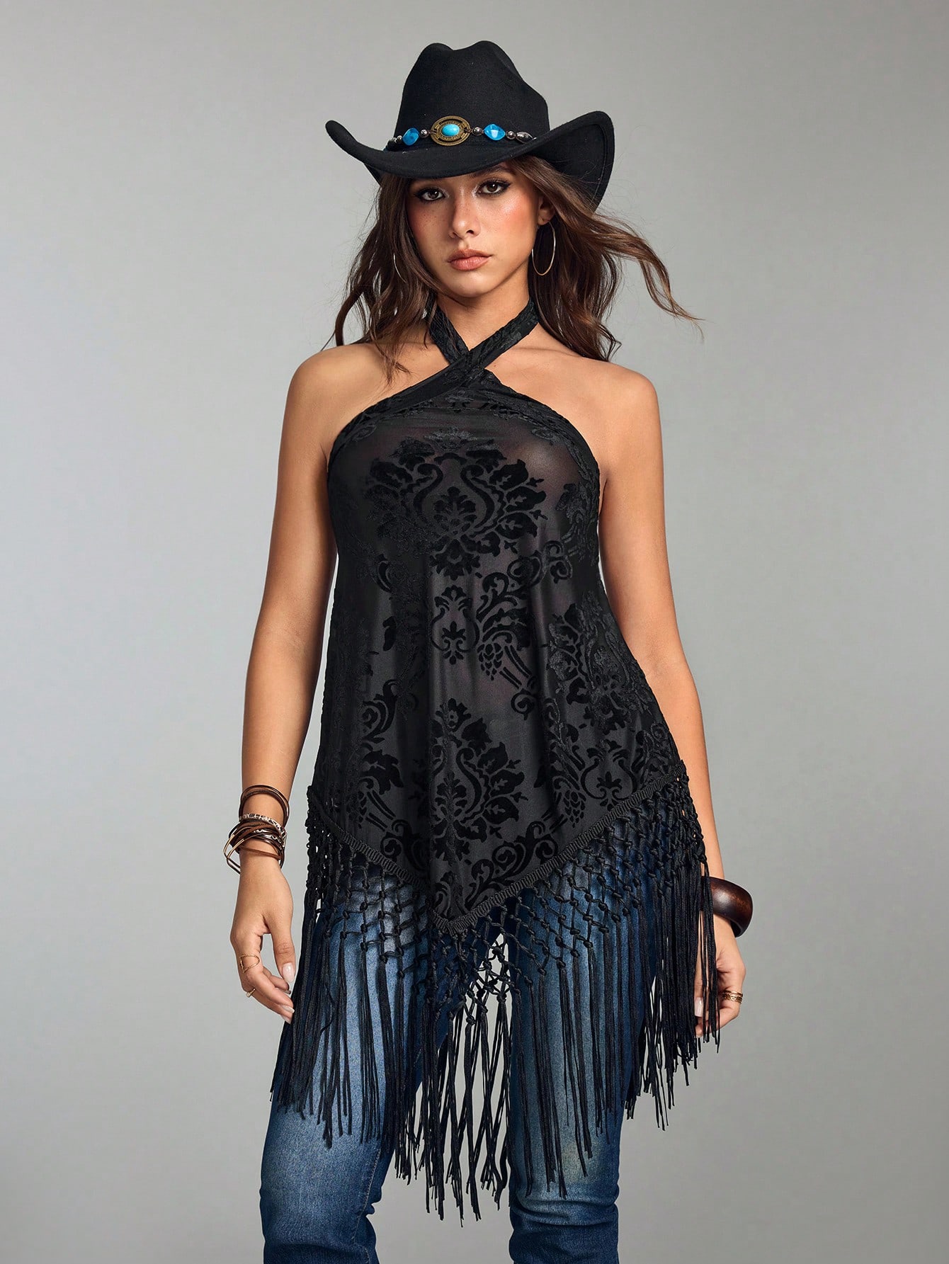 ROMWE Avant Damen sexy Urlaubs-/Musikfestival transparente beflockter Neckholder Quasten asymmetrischer Saum Strandkleid