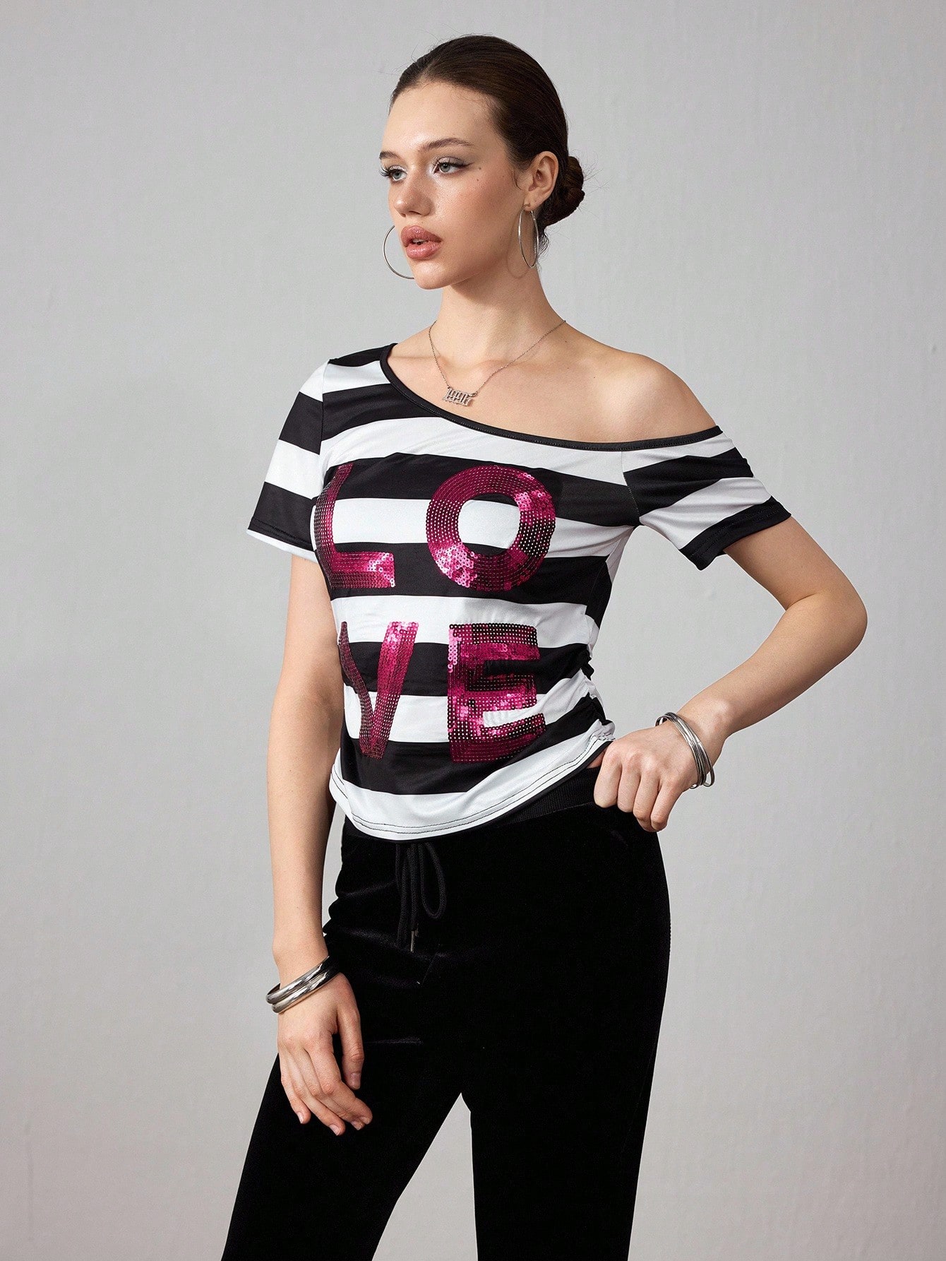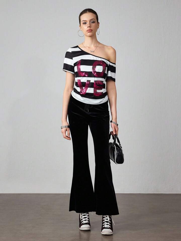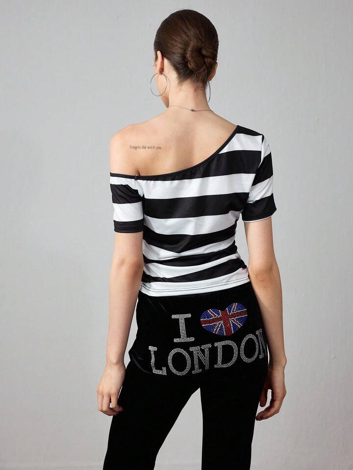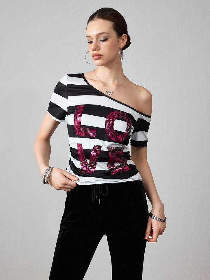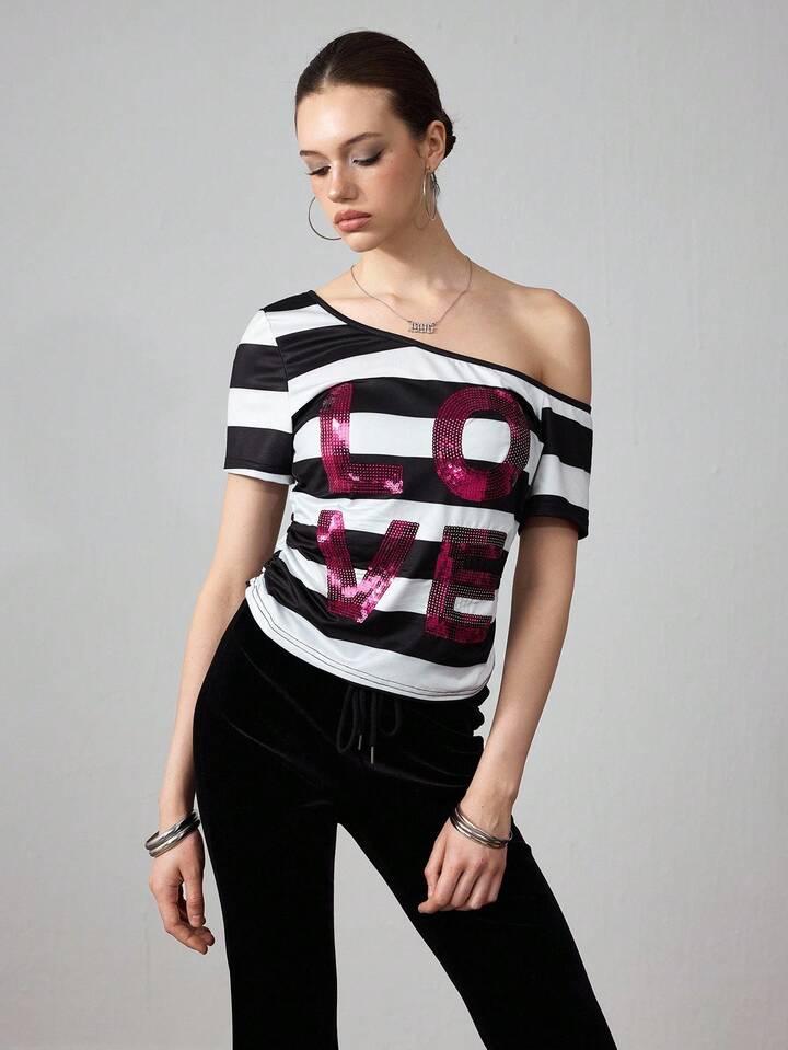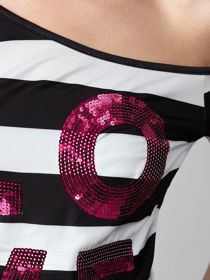 ROMWE Avant Damen Sommer Mode Kontrast Streifen Pailletten Stickerei Asymmetrischer Kragen T-Shirt