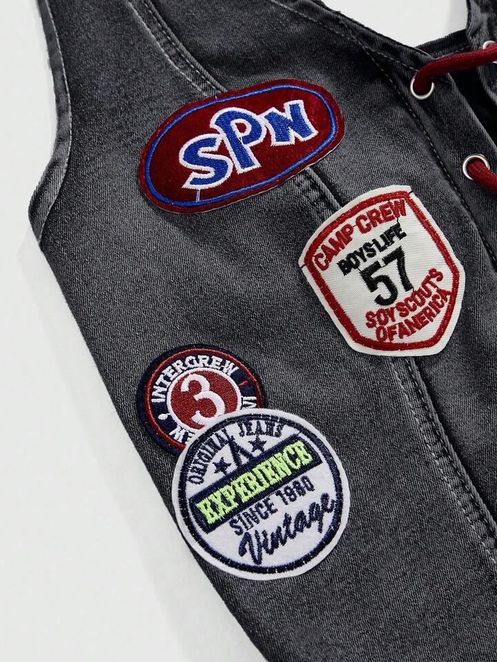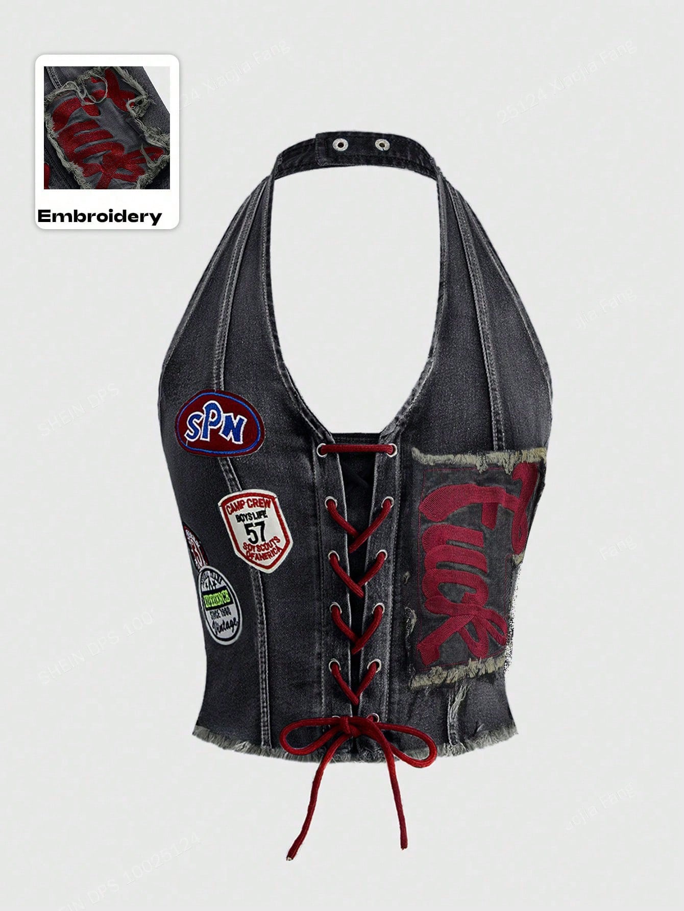 ROMWE Avant Damen Y2K Retro Jersey Sport Ballett Stil Grafik Logo Stickerei Schnürung Taille Sexy Crop Denim Top
