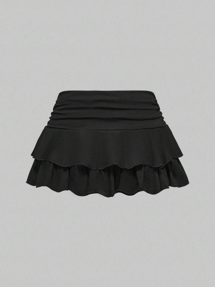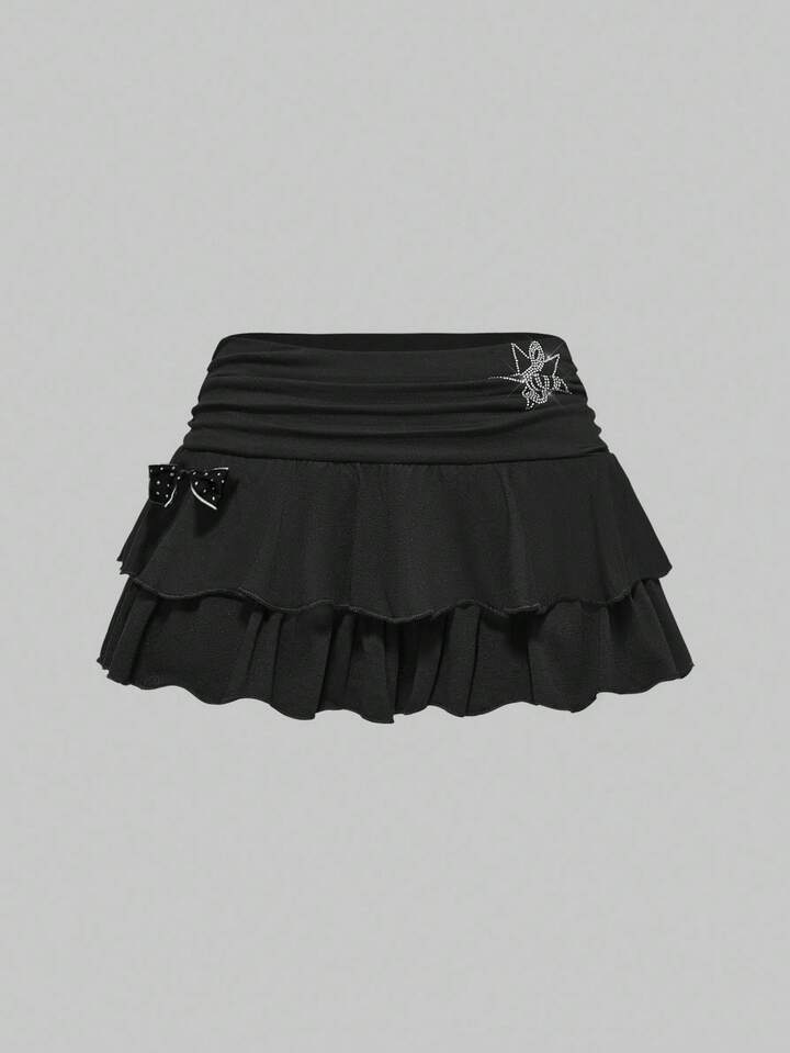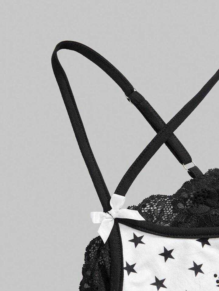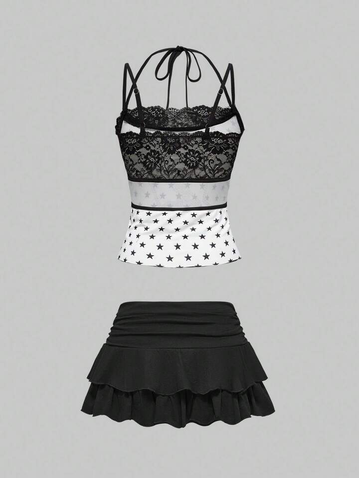 ROMWE Avant Y2K Retro Diva Musiknoten- & Stern-Strass-Muster Spitzen-Trägerhemd & Mini-Rock 2-teiliges Set für Damen, Herbst/Winter