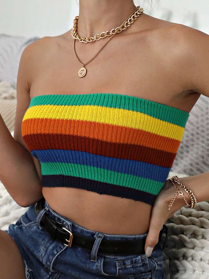 Rippenstrick Tube Top mit Regenbogen Streifen