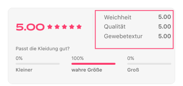 Für einige Produkte bieten wir Merkmale für die Bewertung mehrerer Aspekte an, damit du das Produkt leichter und genauer kennenlernen kannst. Du kannst Produkte nach Produktqualität, Atmungsaktivität, Weichheit, Benutzerfreundlichkeit und anderen Aspekten bewerten; wir berechnen die durchschnittlichen Bewertungen aller Nutzer. Die Gesamtpunktzahl ist 5.
