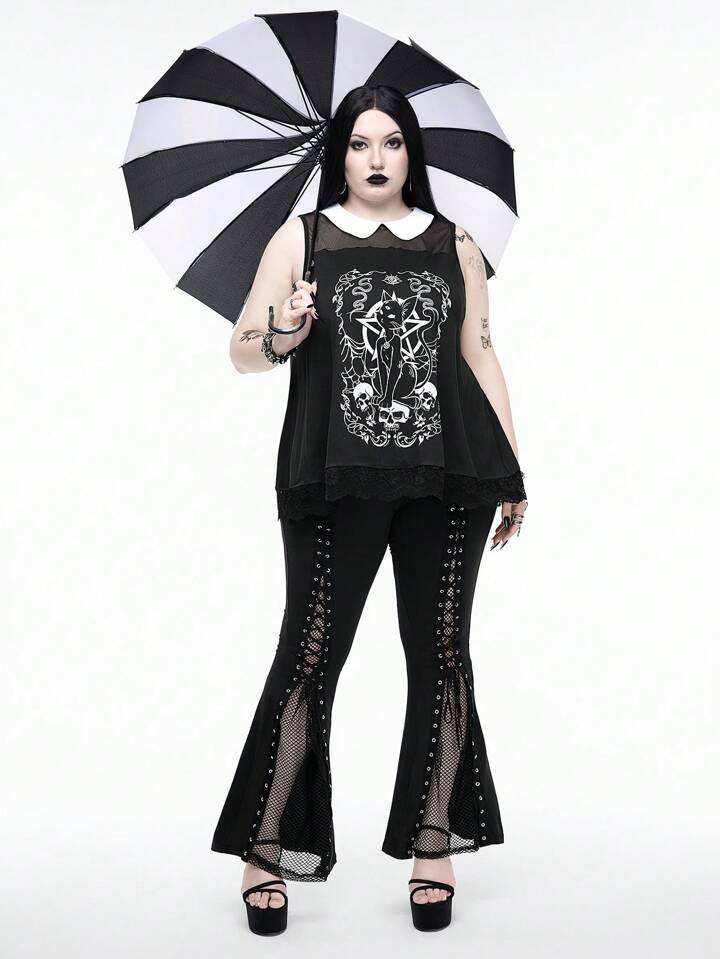 Retro Goth Punk Gothic Katze Stern Totenkopf Muster Mesh Spitze Patchwork Damen Große Größen Top