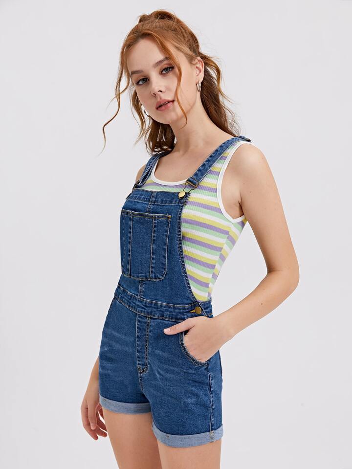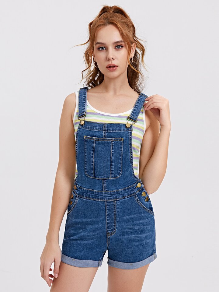 Denim Overall-Shorts mit gerolltem Saum und Knöpfen