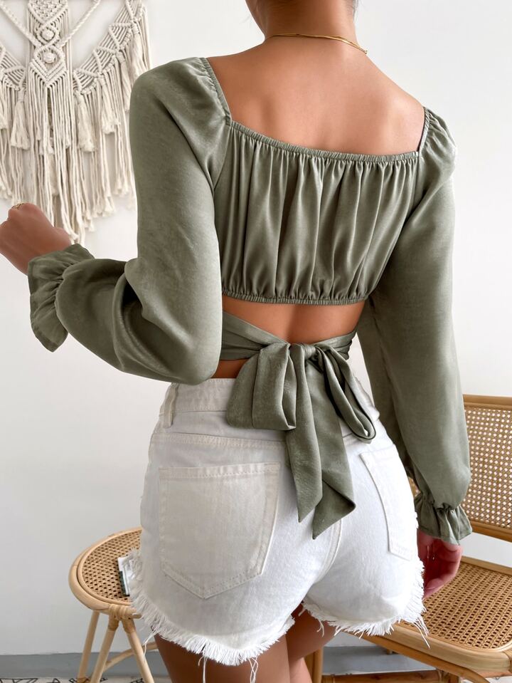 Bluse mit Rüschen, Volant Ärmeln, Band hinten, Crop Satin