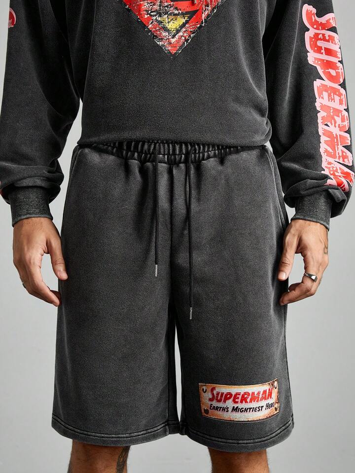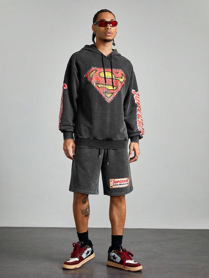 SUPERMAN X ROMWE Herren 2-teiliges Set aus Kapuzen-Sweatshirt mit Buchstabenprint und Shorts