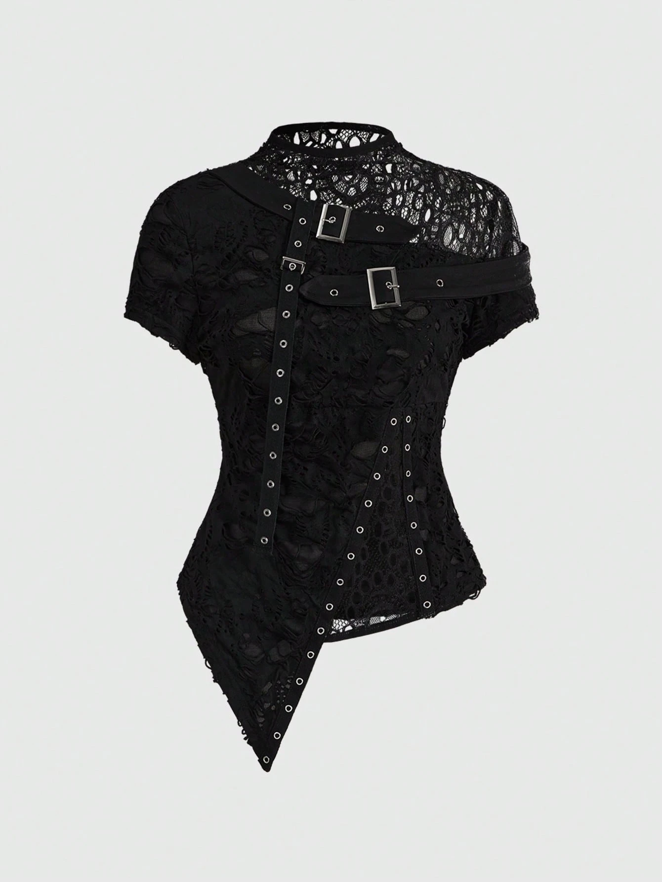 Sexy schwarzes zerrissenes Blumen-Mesh-Patchwork asymmetrisches Punk Goth Stil Top