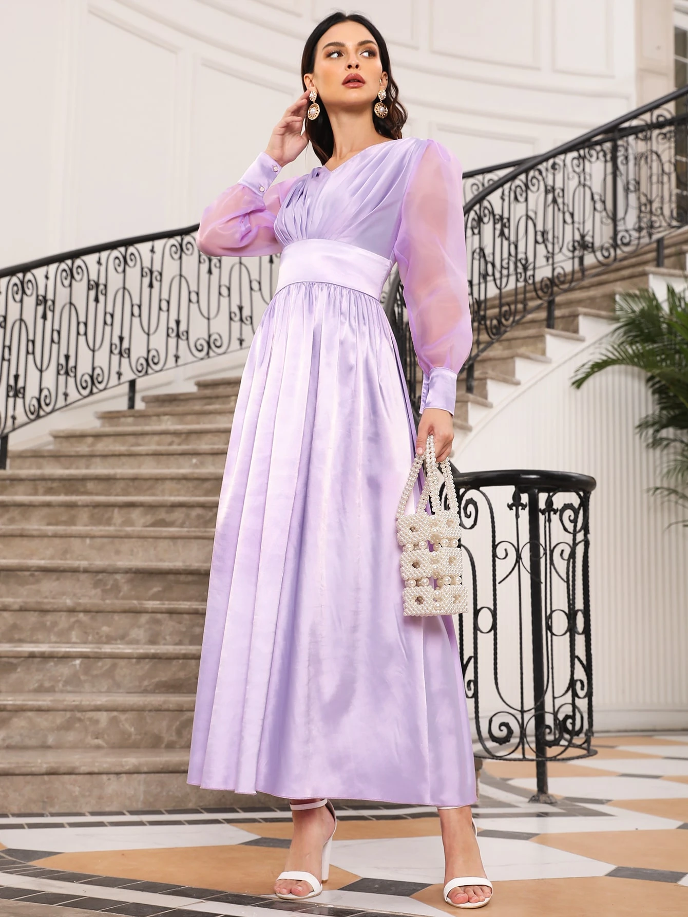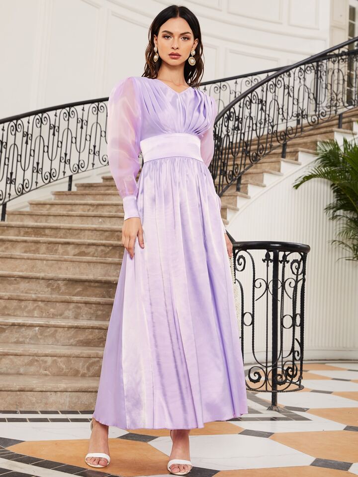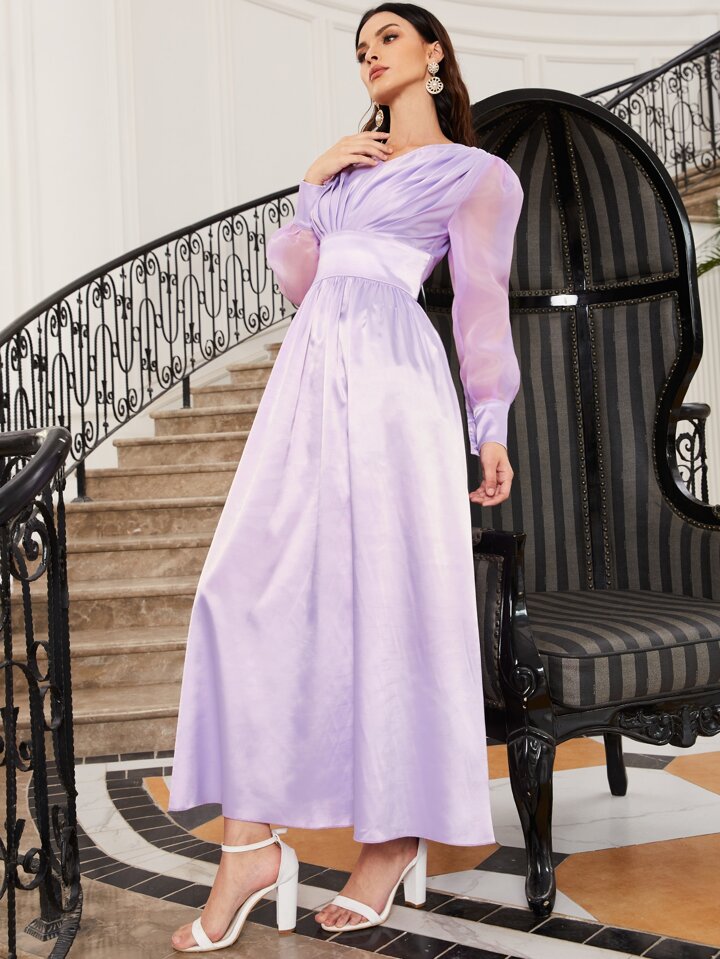 Satin transparentes Prom Kleid mit Laternenärmeln und Falten