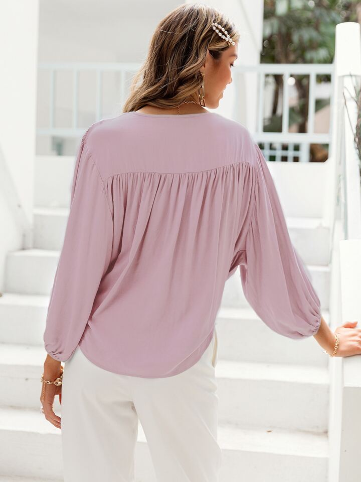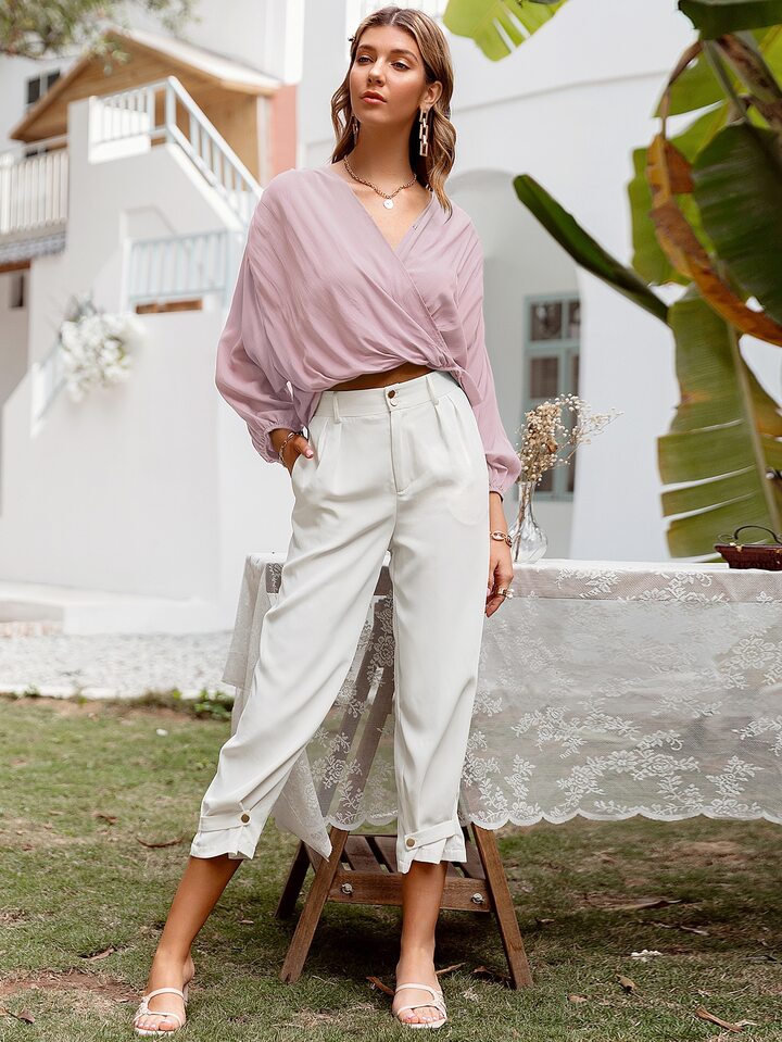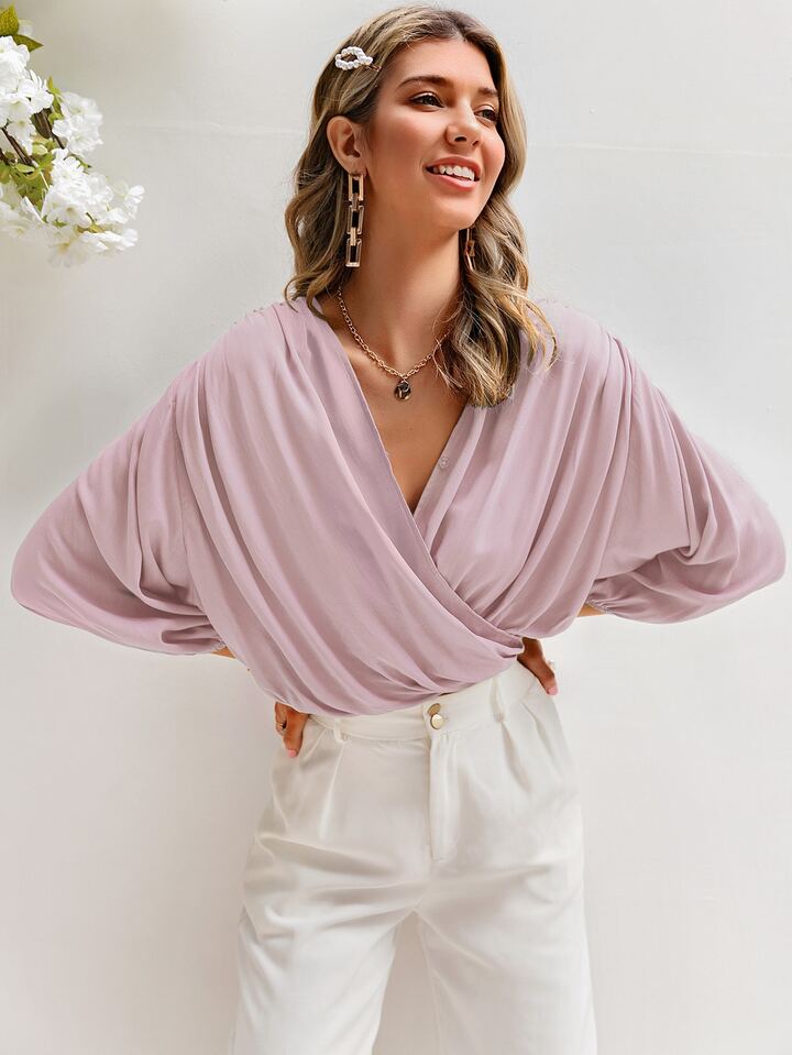Simplee Einfarbiges Top mit Laternenärmeln und Wickel Design