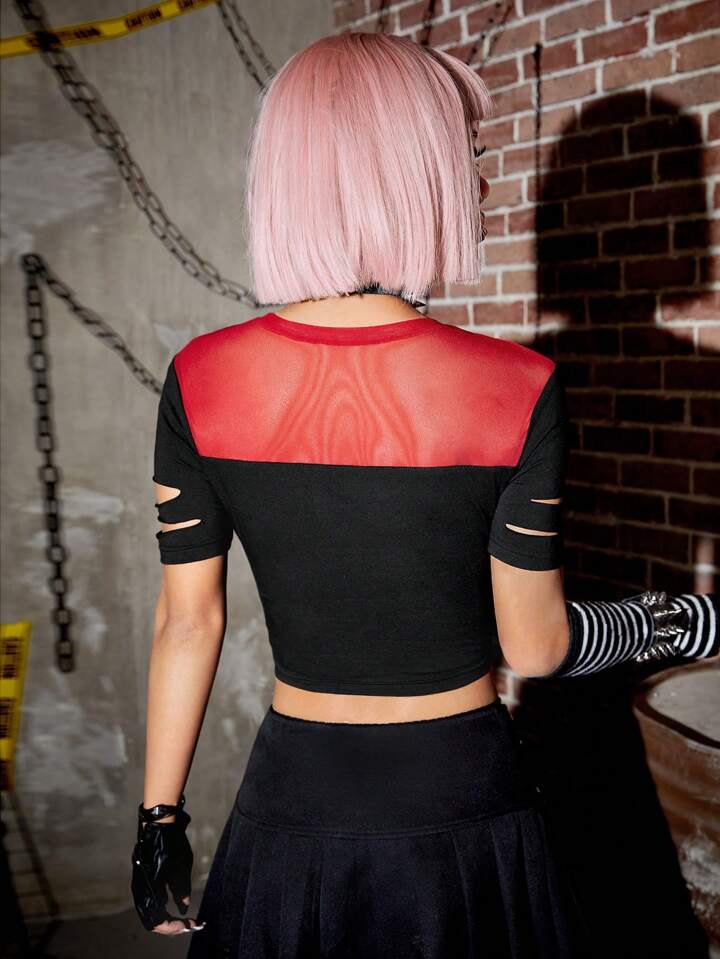 Crop T-Shirt mit Skelett Muster, Farbblock, Ausschnitt,