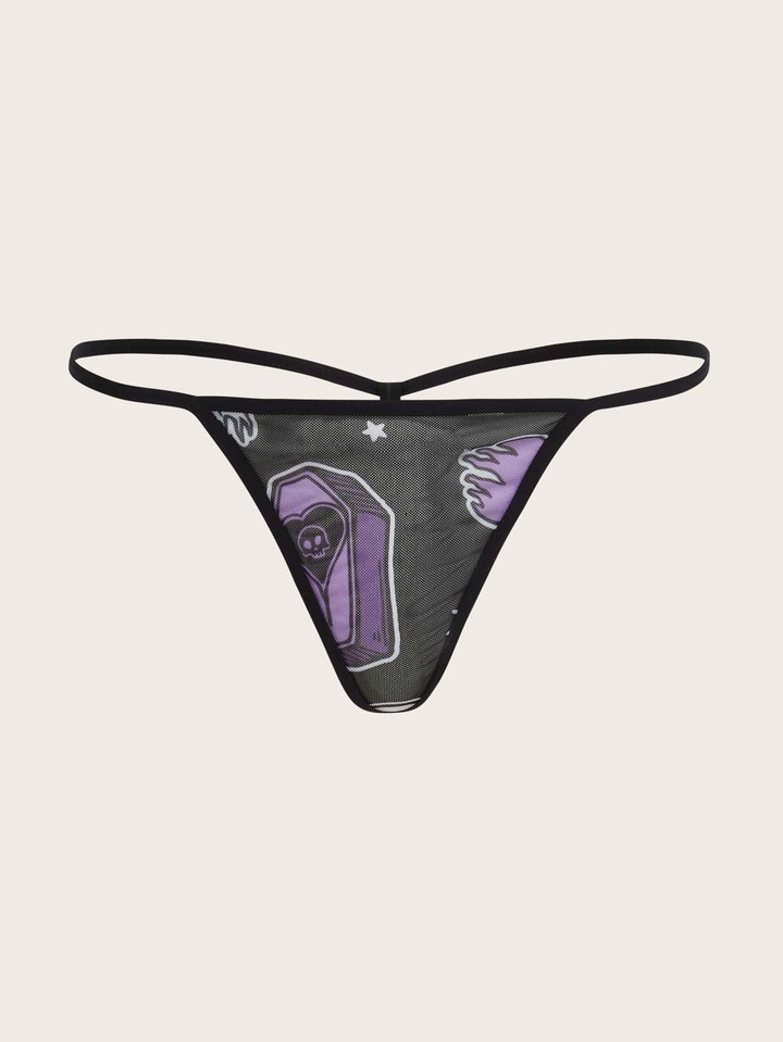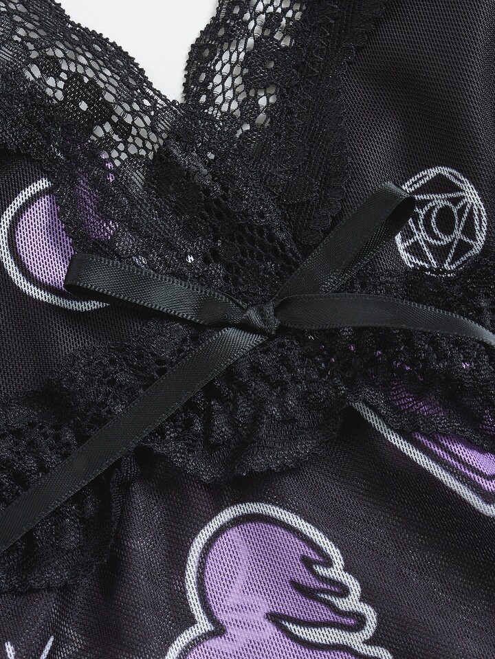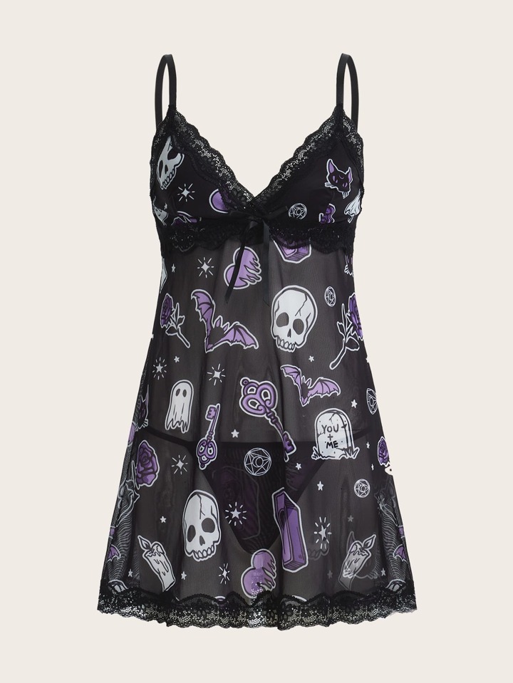 Tanga mit Schädel Muster, Kontrast Spitzen, Negligee mit &