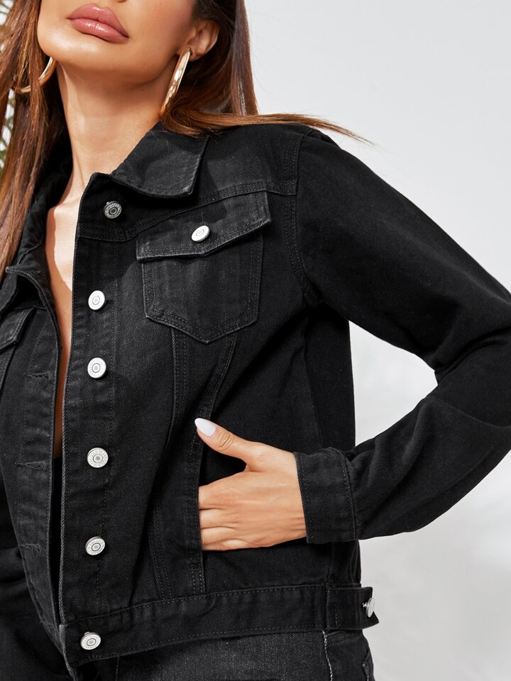 Einfarbige Denim Jacke mit Knöpfen und Taschen Klappe