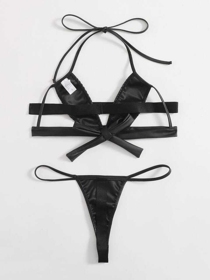 Einfarbige PU Leder Dessous Set mit Ausschnitt