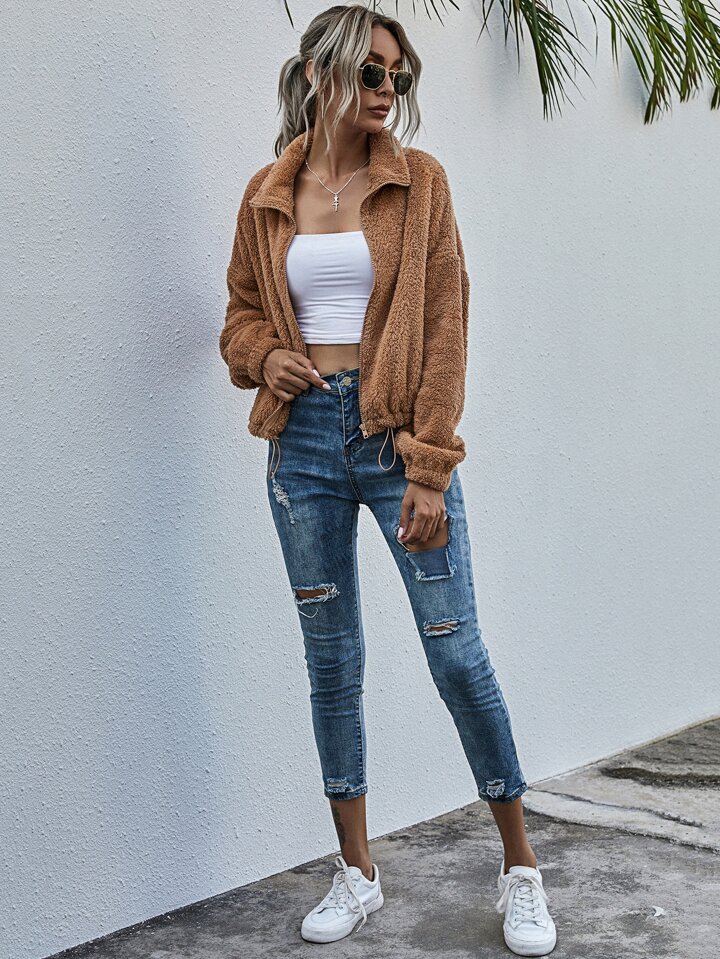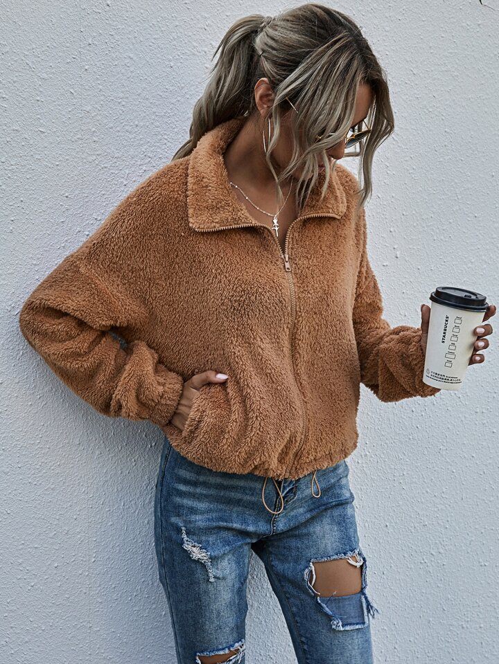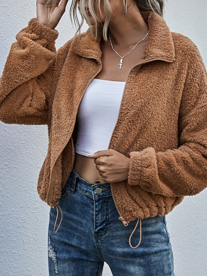 Einfarbige Crop Teddy Jacke mit Kordelzug