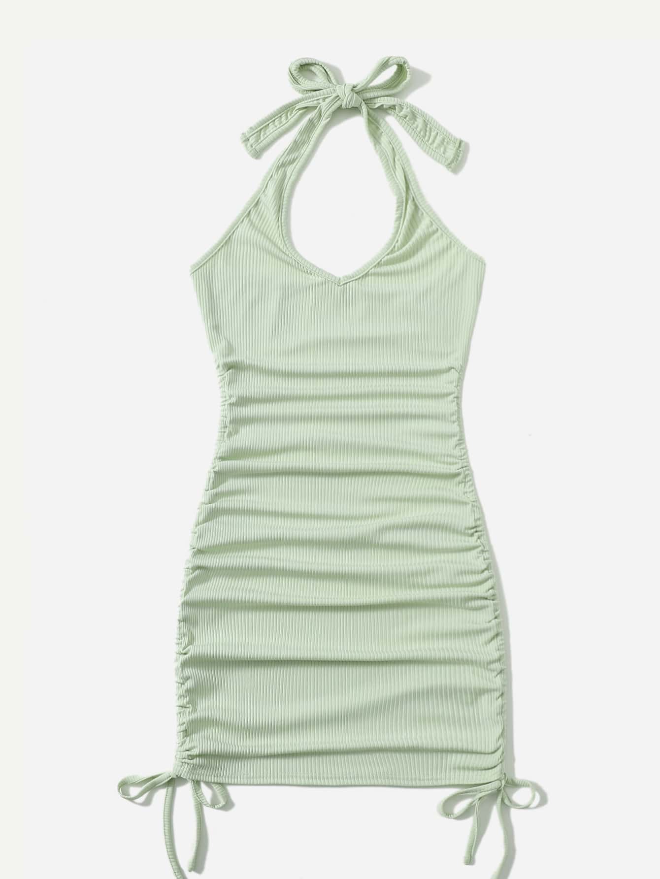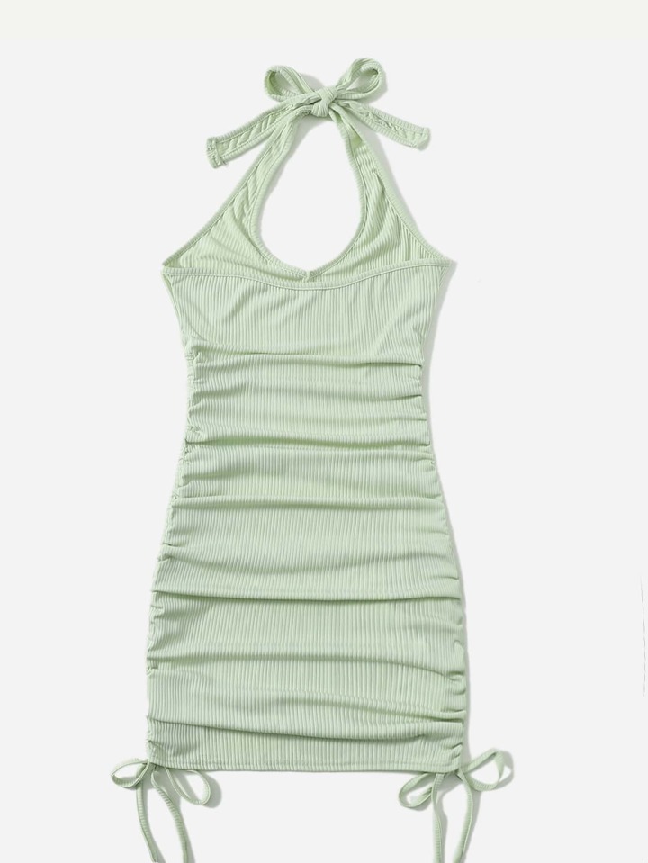 Einfarbiges geripptes Halter Kleid mit Kordelzug