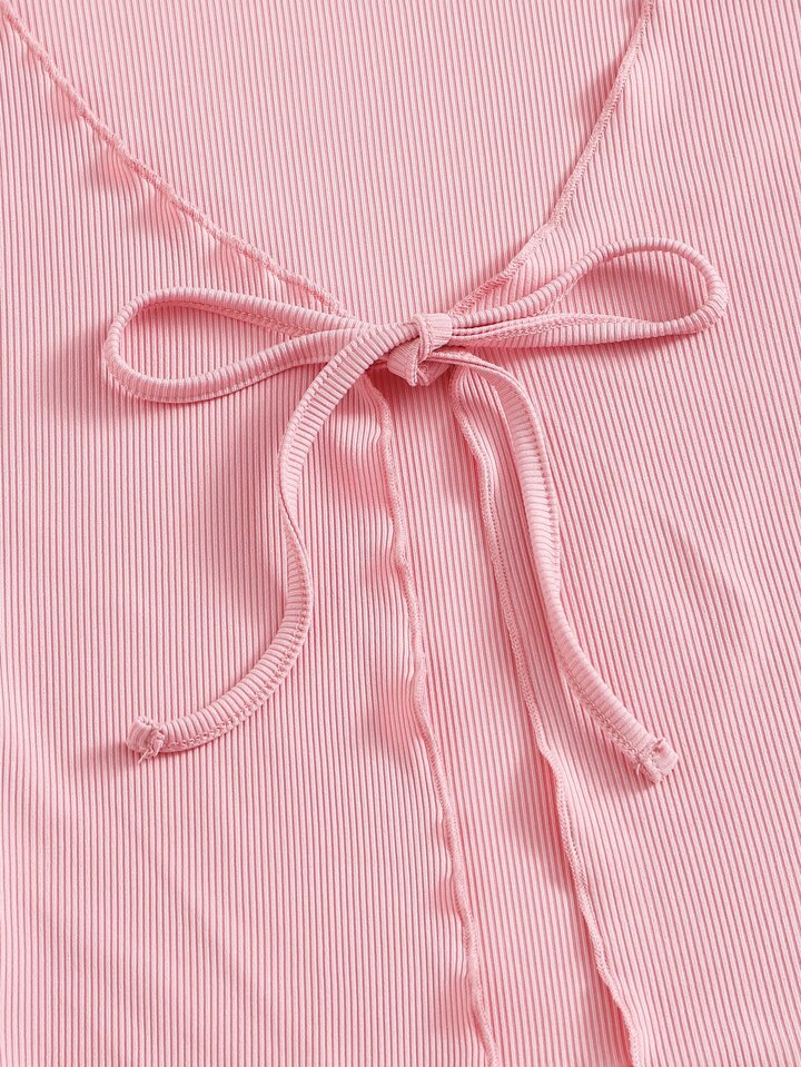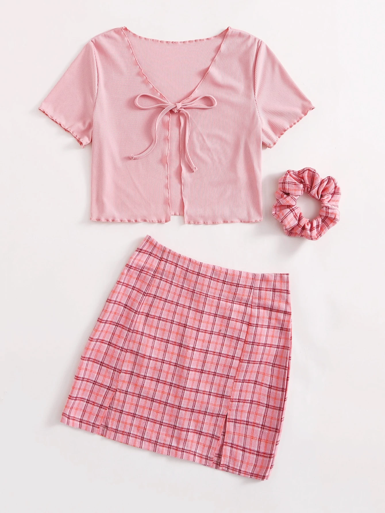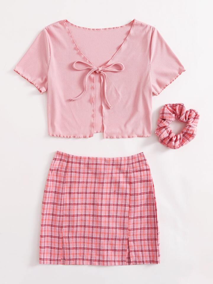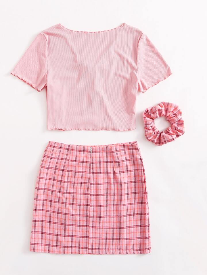Einfarbiges geripptes Top mit Band vorn & Rock mit Karo Muster und Schlitz & Haargummi