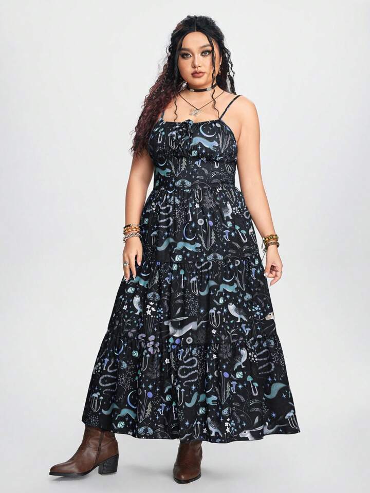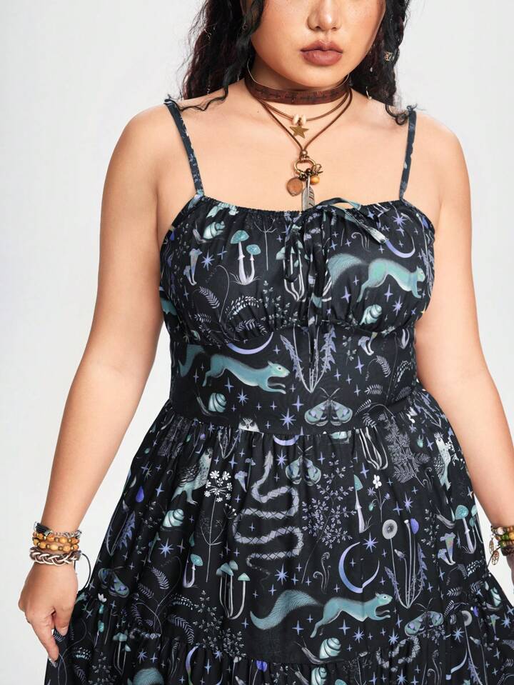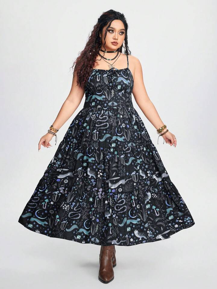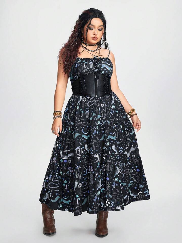 Goth Frühling Sommer Gotik Stil schwarzes Pflanzen- und Hasen-Muster Slim Fit A-Linien Große Größen Kleid