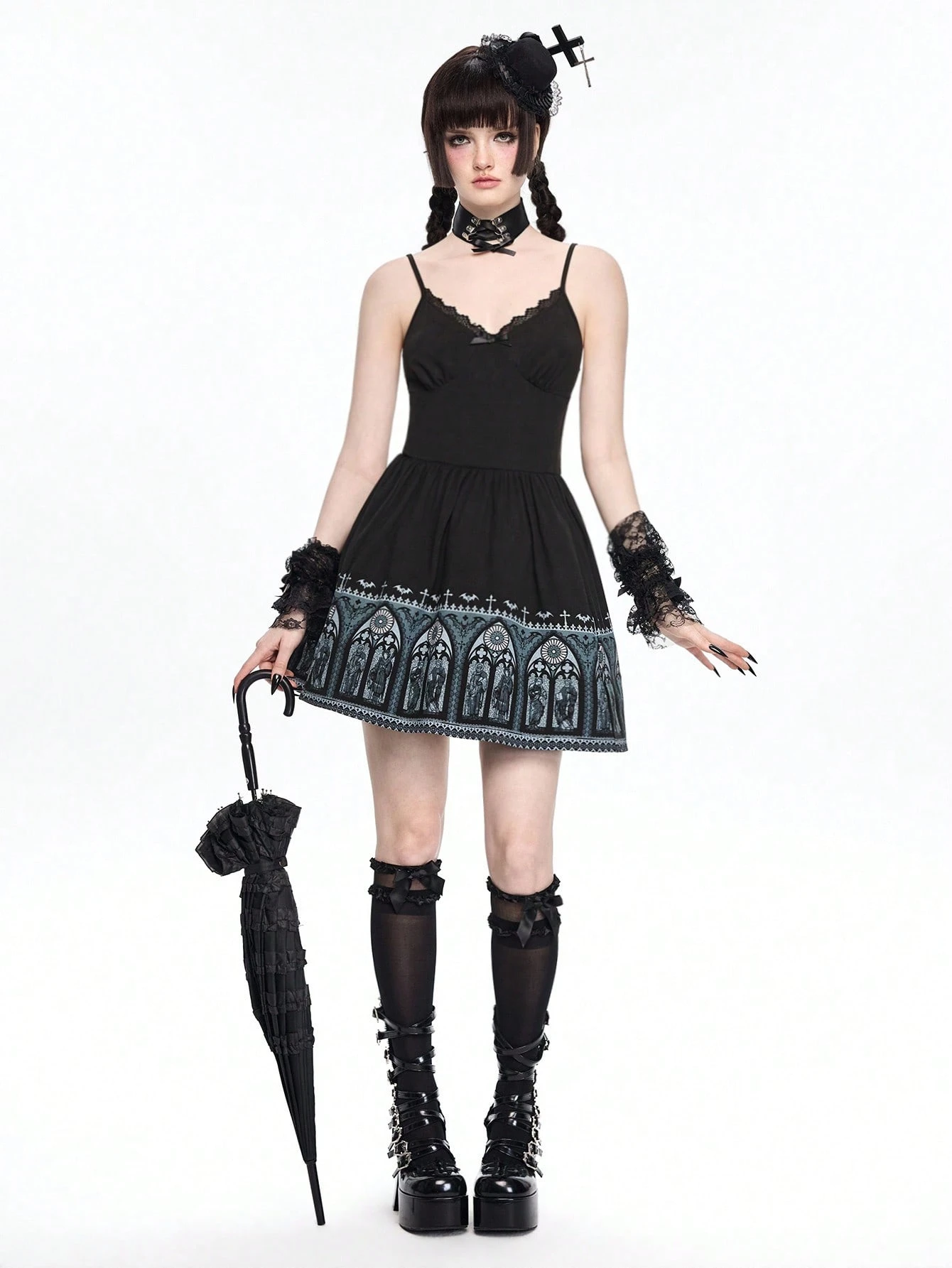 Goth Gotische Kathedrale Buntglas, Statue, Kreuz, Fledermaus, Spitze Patchwork rückenfreies Trägerkleid für Frauen