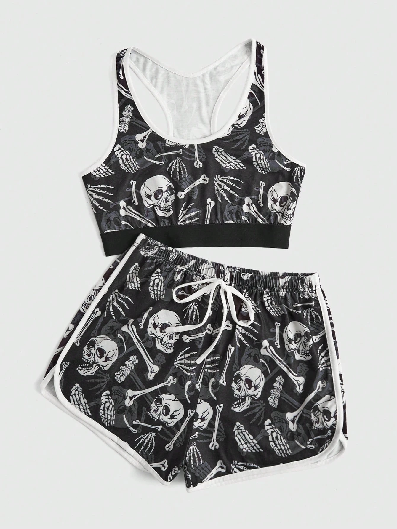 Stayhoom Project Goth Pyjama Set mit Schädel Muster, Kontrastsaum, Schleife Dekor,