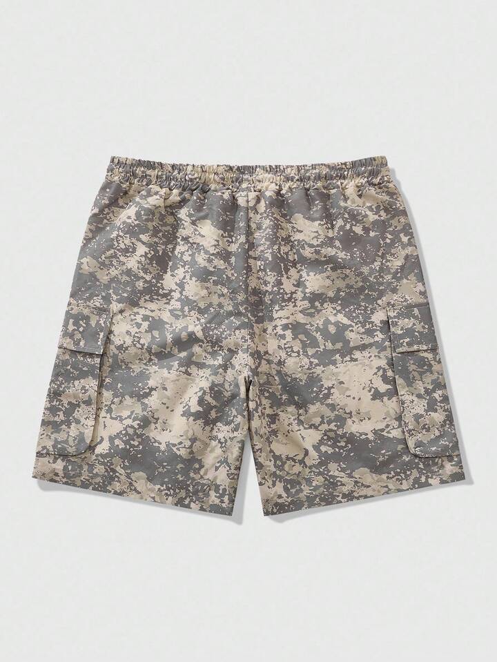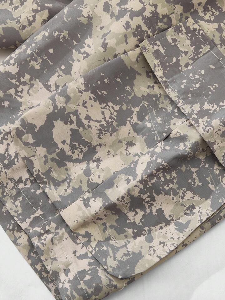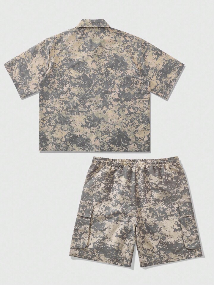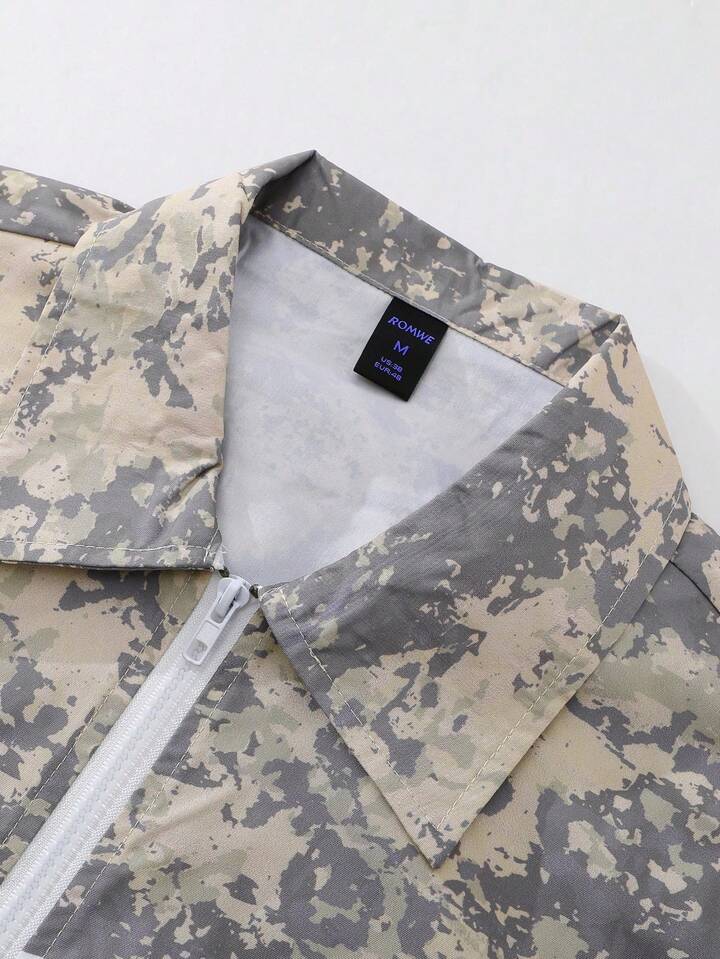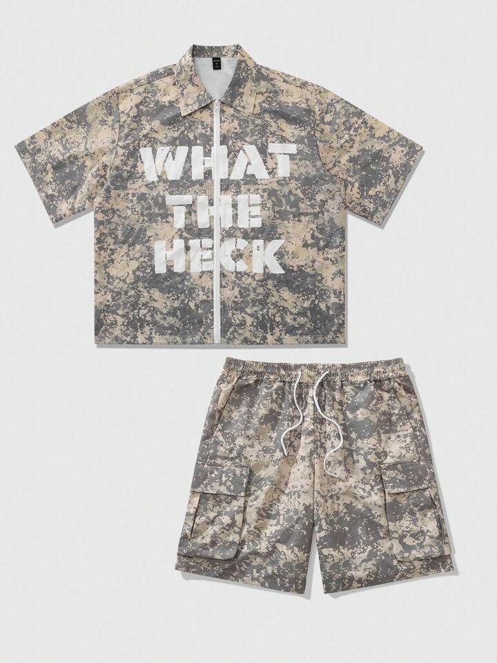 Street Life 2 Stücke Herren Cargo-Stil + Camouflage Muss-haben! Hose mit großen Taschen + Reißverschluss-Hemd mit Buchstaben-Muster, Kurzarm Jacke kombiniert mit Shorts, geeignet für Outdoor, Stadtbummel, stylisch und praktisch!