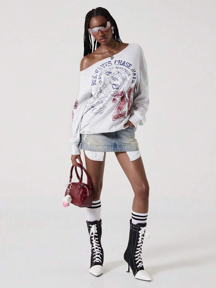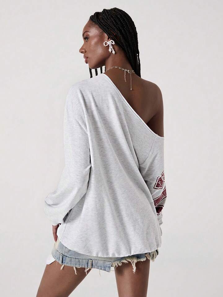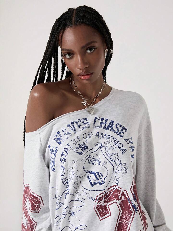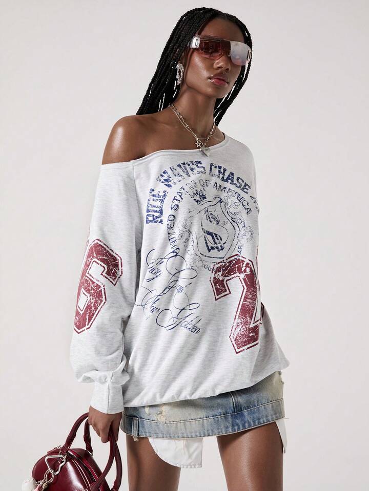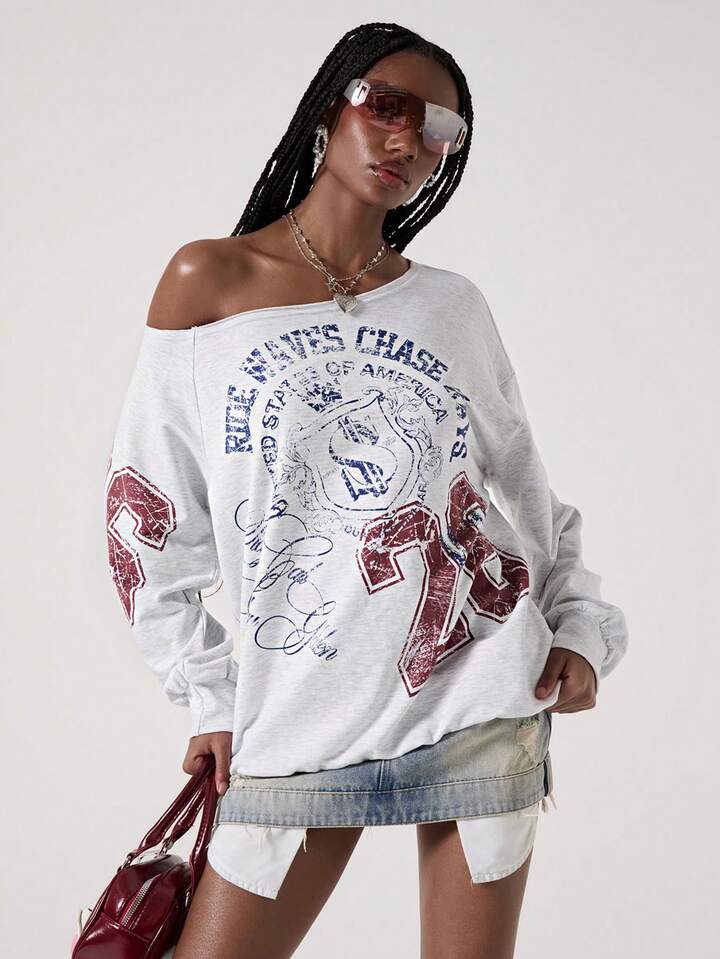 Street Life Amerikanischer lässiger Street-Style Buchstaben-Muster Schräg-Schulter Grau Sweatshirt
