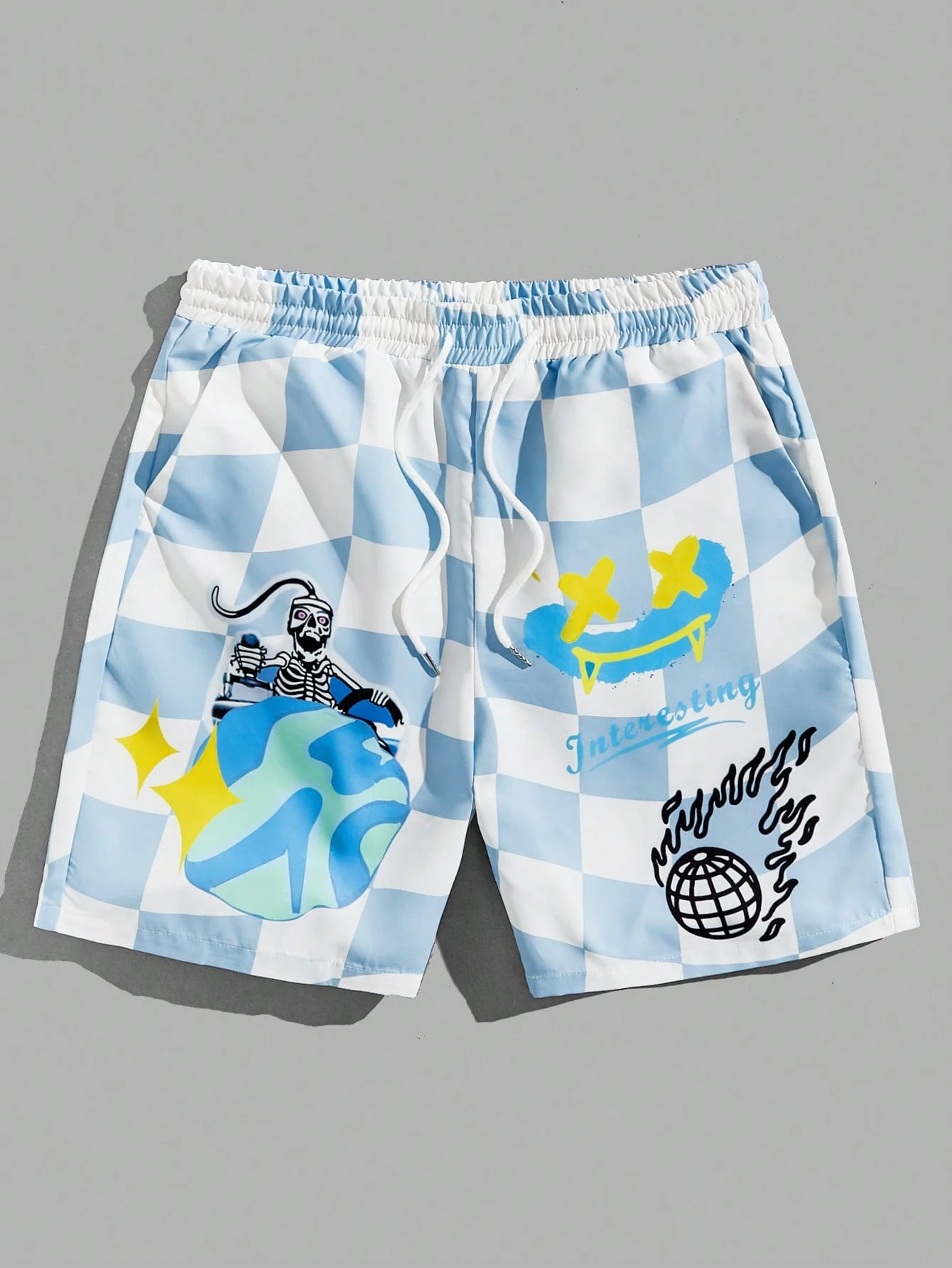Street Life Männer Shorts mit Plaid Cartoon & Buchstabe Grafik, Tunnelzug,