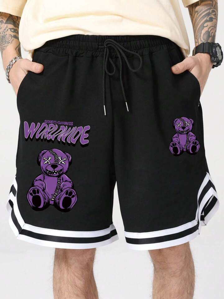 Street Life Herren Shorts mit Bär- und Buchstabengrafik, Streifenbesatz und Kordelzug an der Taille, Schule