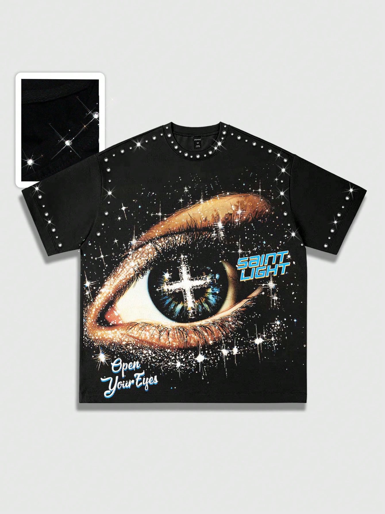 Street Life Herren bedrucktes T-Shirt mit Augen-Strass-Verzierung am Rundhalsausschnitt und Kurzarm, unisex Sommer-Top, 2000er Jahre Stil